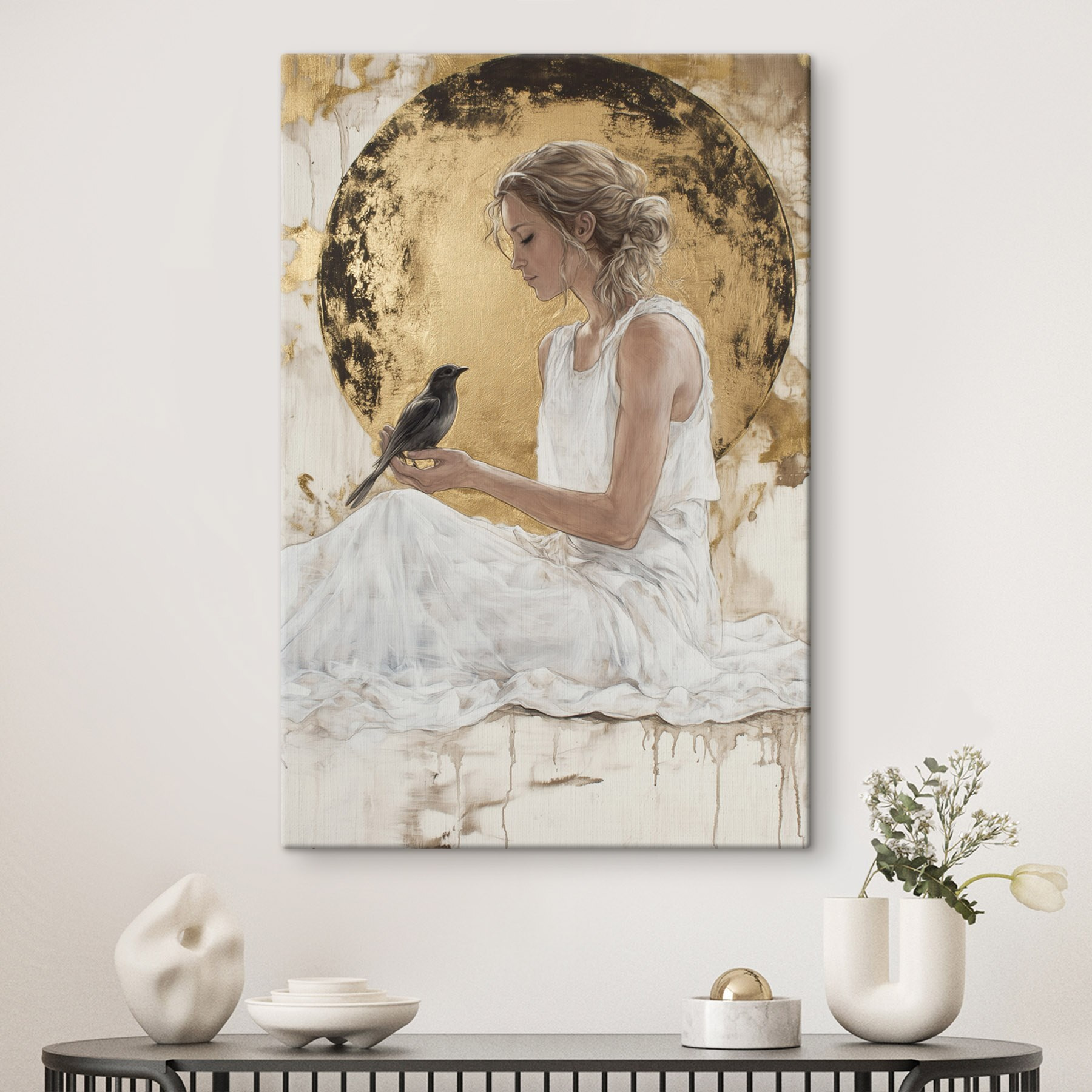 Stel je voor dat je een vleugje serene schoonheid in je kamer brengt met deze prachtige canvasprint. Een vrouw in een vloeiende witte jurk wiegt een vogeltje en creëert zo een moment dat zowel teder als tijdloos aanvoelt. Het is alsof je een glimp opvangt van een vredige droom, waar natuur en menselijkheid prachtig in elkaar overlopen. Hang het in een gezellig hoekje of boven een leeshoekje en je zou wel eens kunnen dagdromen telkens als je langsloopt. Bovendien voegt het een warme, uitnodigende sfeer toe – perfect voor het aanknopen van diepe gesprekken bij een kopje koffie of thee. Over een gespreksstarter gesproken!