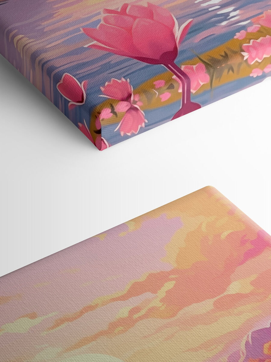 Stel je voor dat je een ruimte binnenloopt en begroet wordt door een prachtig uitzicht van roze bloemen die dansen naast een rustig meer. Deze canvasprint vangt dat perfecte moment waar natuur en kunst elkaar ontmoeten en nodigt uit tot een gevoel van kalmte en vreugde. De zachte tinten van een zonsondergang schilderen de lucht en weerspiegelen op magische wijze op het water. Het is alsof je een stukje paradijs in huis haalt. Perfect voor een gezellig leeshoekje of zelfs boven een eettafel, dit stuk wekt dagdromen en vredige vibes op. Het is meer dan een decorstuk; het is een stukje sereniteit aan je muur. Iedere keer als je er een blik op werpt, word je overspoeld door een golf van rust. Dat is het waard om te onthouden.