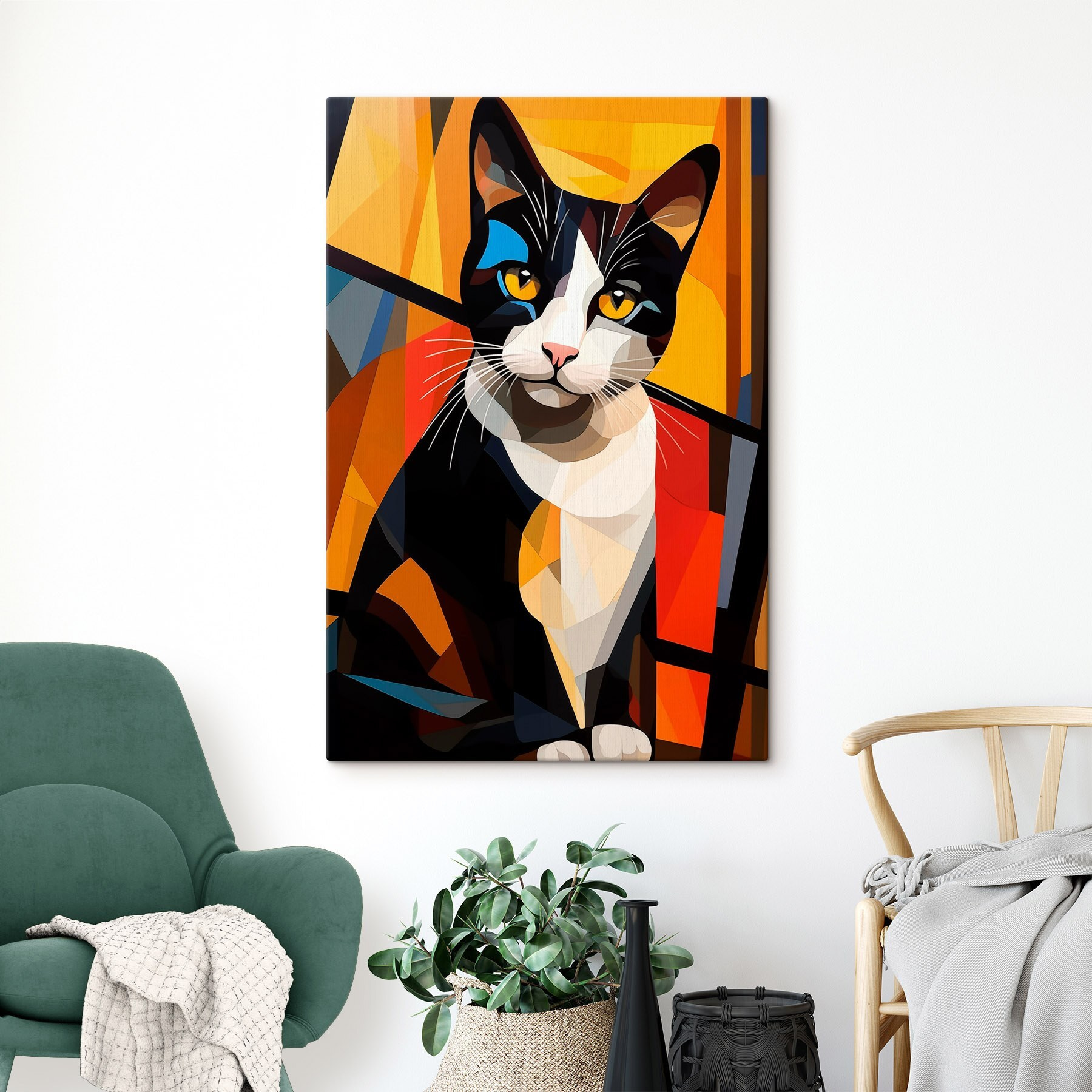 Transformeer je woonruimte met deze levendige canvasprint met een opvallende kat met gele ogen. De felle kleuren en geometrische vormen brengen een energie die elke kamer kan opfleuren. Stel je voor dat deze speelse kat de wacht houdt over je gezellige hoekje of inspireert tot leuke gesprekken tijdens bijeenkomsten. Het is alsof dit nieuwsgierige katje iedereen uitnodigt om hun wildste avonturen te delen. Plus, het voegt een grillig tintje toe zonder het gedoe van eten geven of kattenbakvulling schoonmaken. Perfect voor kattenliefhebbers of iedereen die een vleugje creativiteit wil, dit kunstwerk zal zeker in de smaak vallen.
