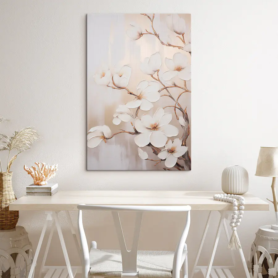 Een ruimte transformeren kan zo eenvoudig zijn als het toevoegen van deze canvasprint van witte bloemen. Het is alsof je een frisse wind door je huis laat waaien. Stel je voor dat je wakker wordt en een glimp opvangt van deze bloesems – het is een instant moodboost! De delicate bloemblaadjes en subtiele kleuren creëren een rustgevende sfeer, perfect voor elke kamer, van de woonkamer tot een gezellig leeshoekje. Of het nu een vredige sfeer creëert voor zen-momenten of dient als een vrolijke gespreksstarter, dit stuk straalt elegantie uit zonder poespas. Wie wil er nu geen vleugje natuurschoon aan de muur?