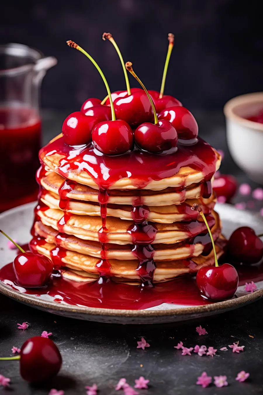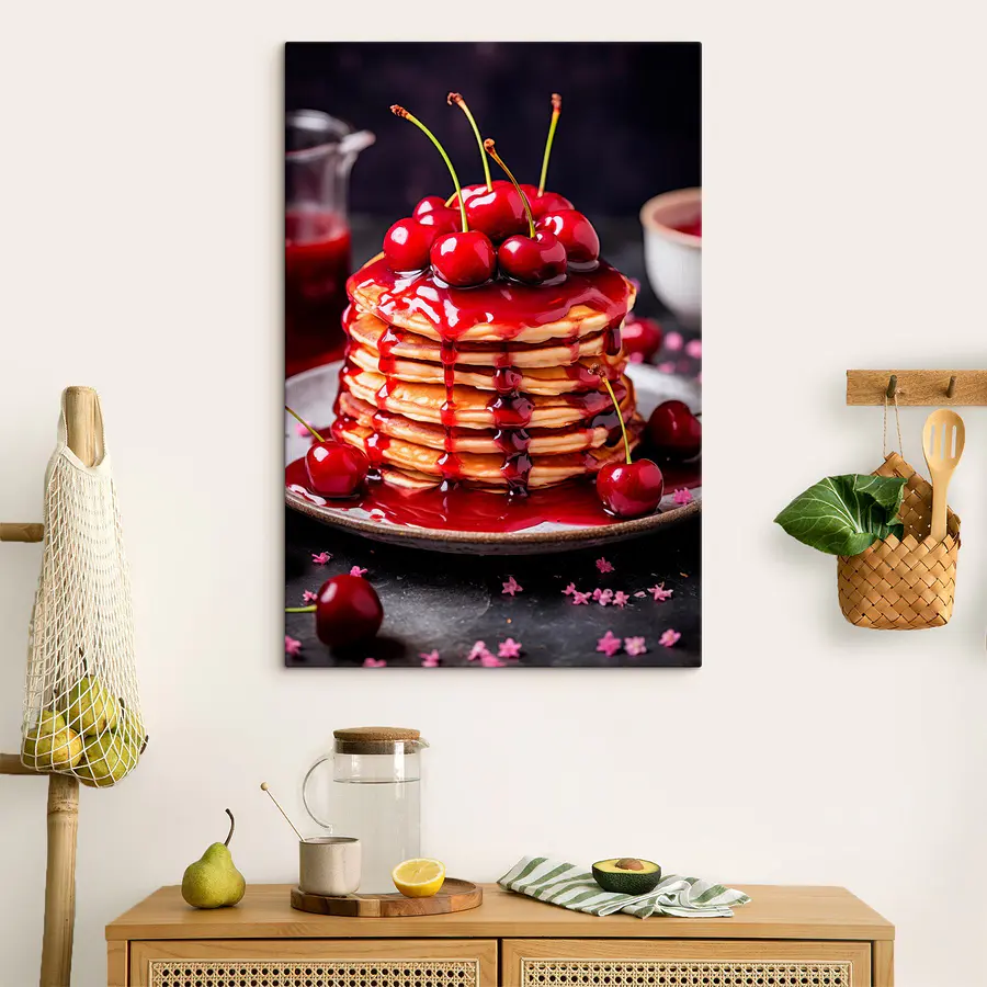 Stel je voor dat je wakker wordt met een stapel pannenkoeken die er gewoon om smeken om verslonden te worden. Deze canvasprint legt dat heerlijke moment vast, overgoten met zoete kersensiroop en overgoten met heldere, sappige kersen. Het is als een warme knuffel voor je keuken of eethoek, die onmiddellijk vreugde en een beetje honger opwekt (het gebeurt!). Perfect voor iedereen die gelooft dat eten kunst is, en wat is er mooier dan een culinair meesterwerk? Dit levendige stuk voegt een vleugje kleur en eigenzinnigheid toe en stuurt gesprekken in de richting van brunch en de zoetste momenten van het leven. Hang het op en laat de pannenkoekenvibes maar stromen!