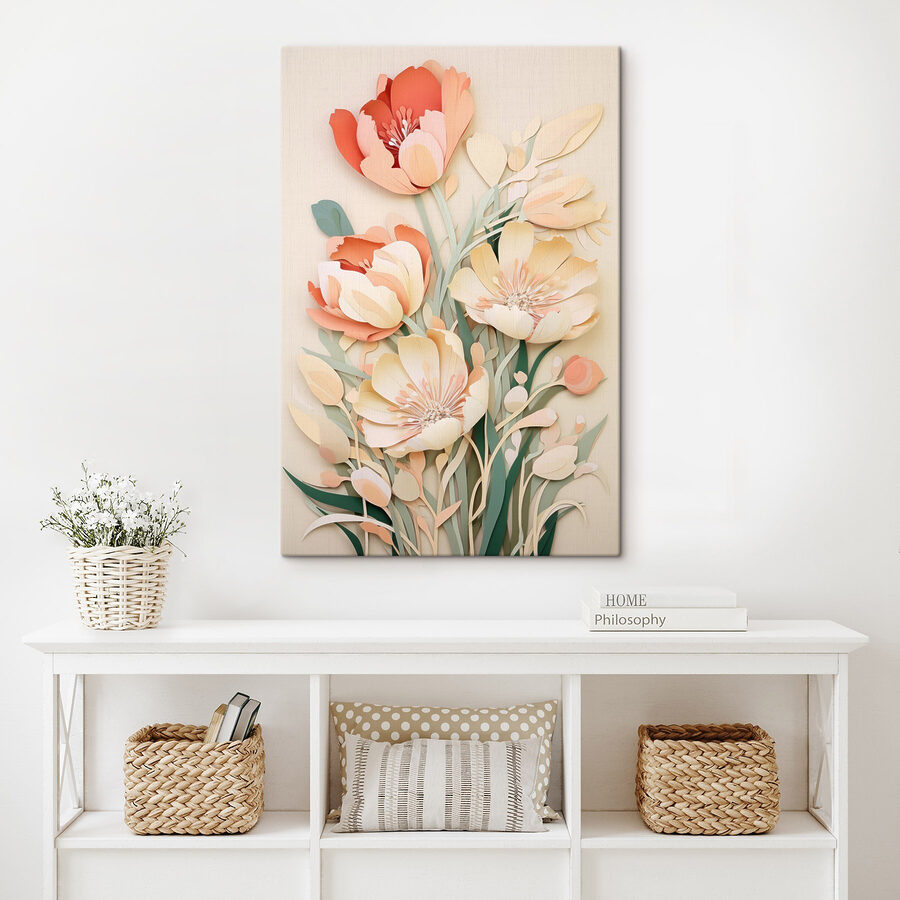 Transformeer elke ruimte met deze betoverende canvasprint met prachtige papiergesneden bloemen die een vleugje natuur binnenshuis brengen. Stel je voor dat je je kamer binnenloopt en een golf van rust over je heen voelt komen, terwijl deze levendige bloemen op de muur dansen en het hele jaar door lentegevoelens oproepen. Perfect om een woonkamer op te fleuren of een speelse draai aan een slaapkamer te geven, het is alsof je een persoonlijke tuin hebt zonder het gedoe van water geven. Vrienden zullen zich afvragen hoe je zo’n moeiteloze charme voor elkaar krijgt. Het is niet alleen decor; het is een uitnodiging om even te stoppen en aan de bloemen te ruiken – of in dit geval, ze te bewonderen.