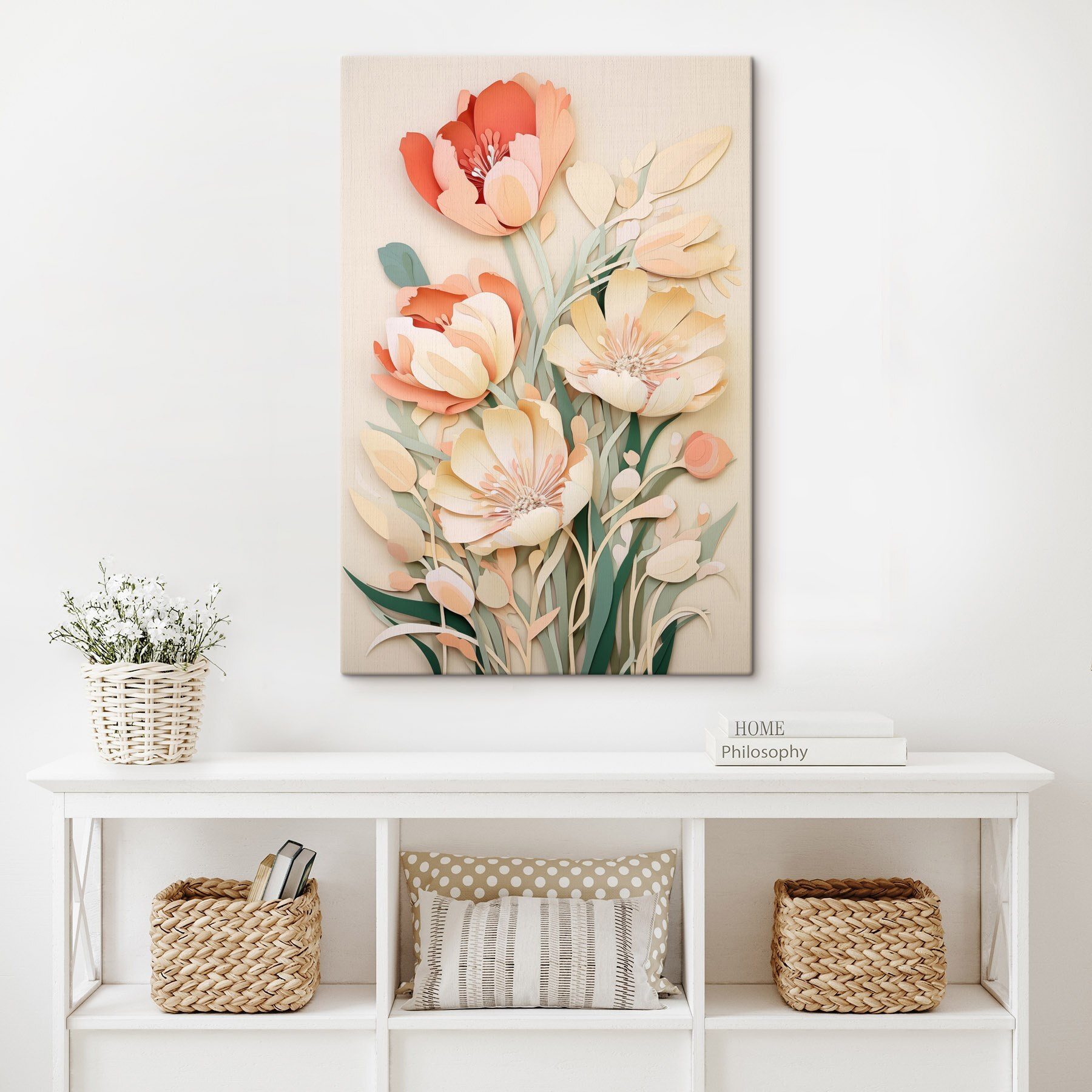 Transformeer elke ruimte met deze betoverende canvasprint met prachtige papiergesneden bloemen die een vleugje natuur binnenshuis brengen. Stel je voor dat je je kamer binnenloopt en een golf van rust over je heen voelt komen, terwijl deze levendige bloemen op de muur dansen en het hele jaar door lentegevoelens oproepen. Perfect om een woonkamer op te fleuren of een speelse draai aan een slaapkamer te geven, het is alsof je een persoonlijke tuin hebt zonder het gedoe van water geven. Vrienden zullen zich afvragen hoe je zo’n moeiteloze charme voor elkaar krijgt. Het is niet alleen decor; het is een uitnodiging om even te stoppen en aan de bloemen te ruiken – of in dit geval, ze te bewonderen.