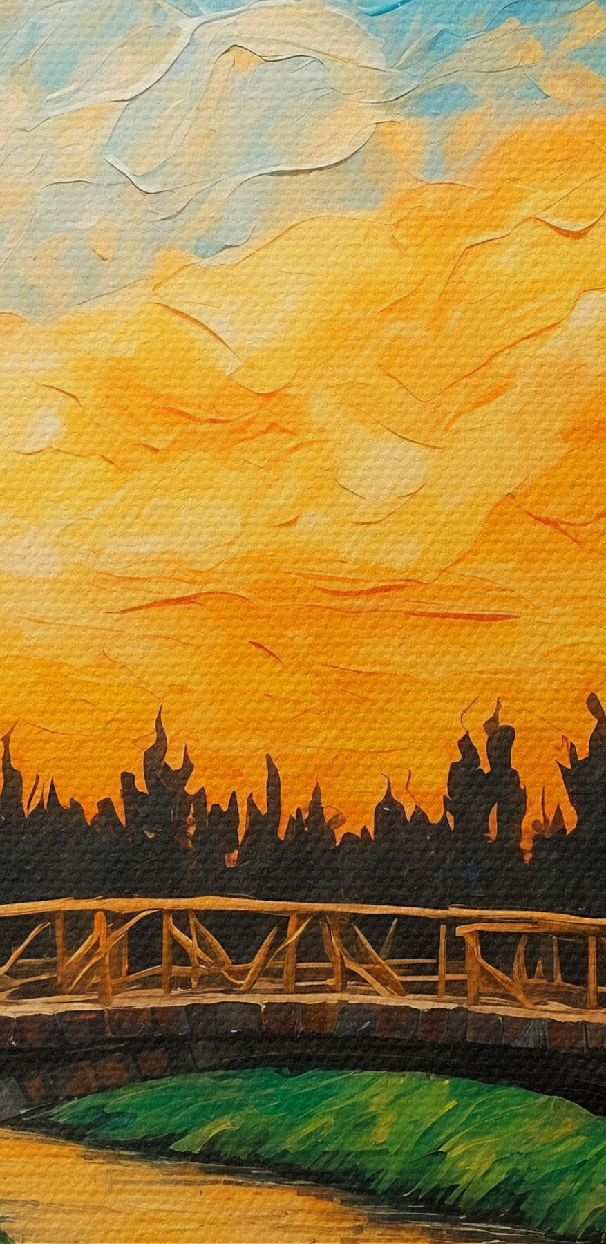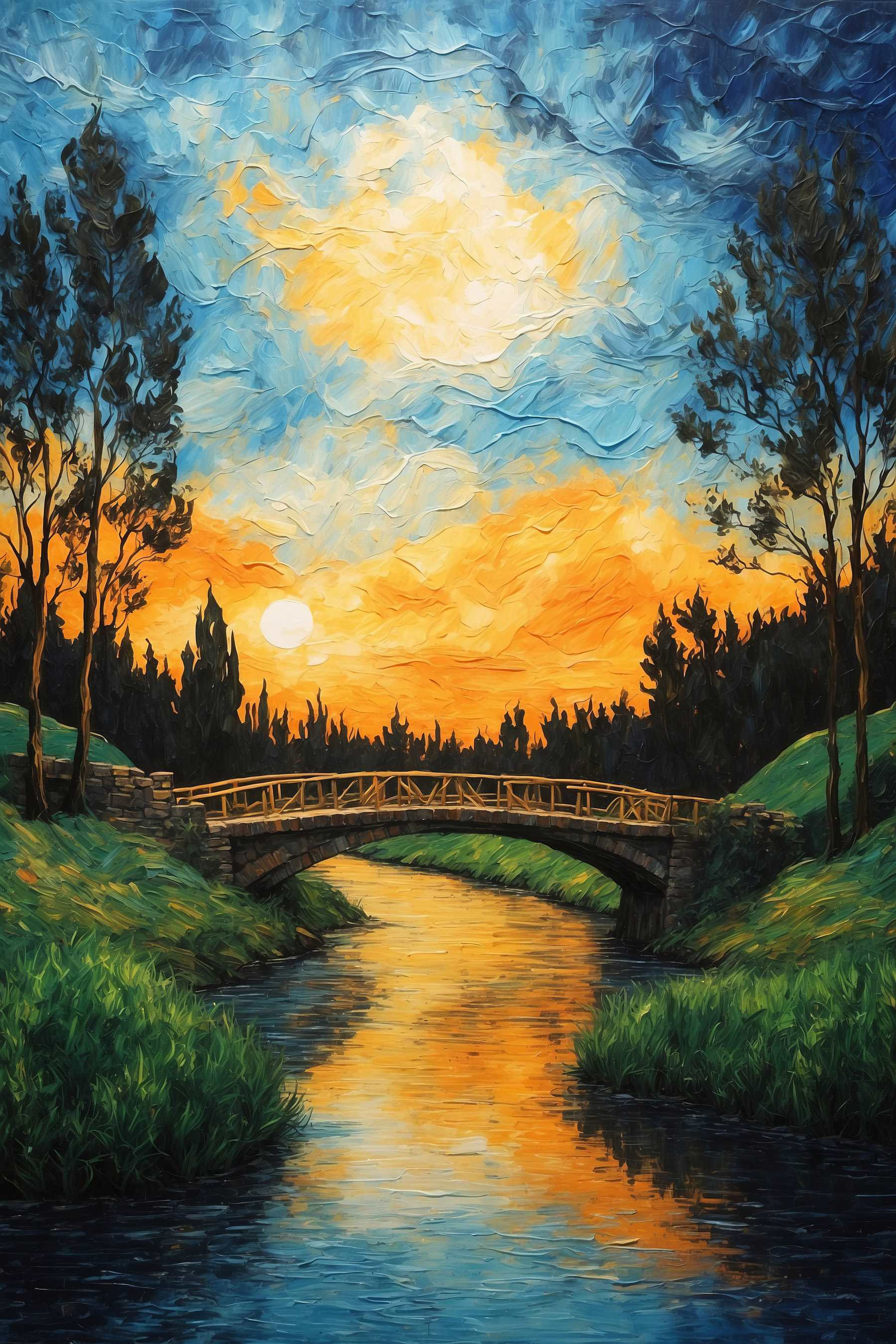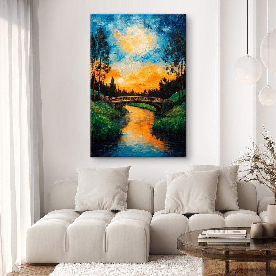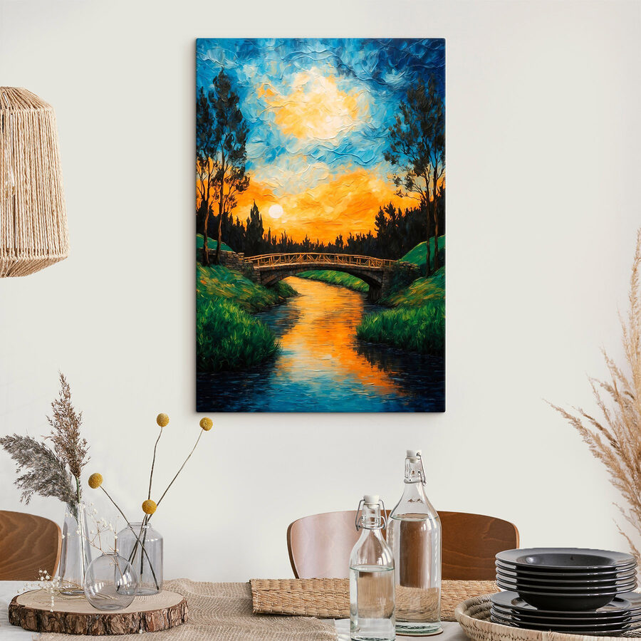 Tover elke kamer om in een serene ontsnapping met deze prachtige canvasprint, “Bridge over a River”. Stel je een rustige avond voor, de zonsondergang schildert de lucht in warme tinten terwijl het water het kleurrijke schouwspel weerspiegelt. De zachte kromming van de brug nodigt uit tot dagdromen over ontspannen wandelingen of rustige momenten om alles in je op te nemen. Dit stuk voegt een vleugje elegantie van de natuur toe en herinnert je eraan diep adem te halen en tot rust te komen. Het is alsof je een stukje van het buitenleven naar binnen haalt – perfect voor die gezellige leeshoek of om een lege muur op te fleuren. Zowel natuur- als decorliefhebbers zullen het waarderen hoe het naadloos in elke stijl past en vreugde en dwalende gedachten opwekt.