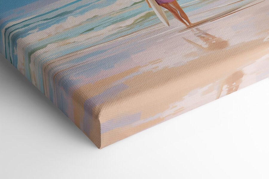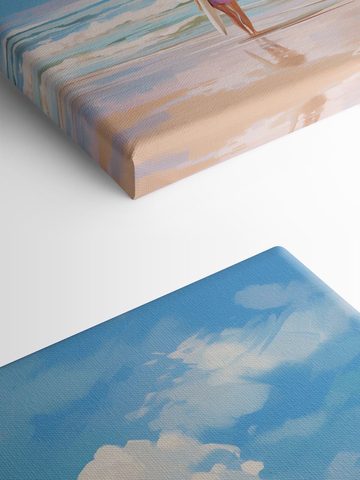 Stel je voor: de zon verwarmt je huid, het geluid van beukende golven vult de lucht en daar is een meisje met een surfplank, klaar voor een avontuur. Deze canvasprint vangt die zalige strandsfeer. Het is als een venster naar het paradijs aan je muur. De zachte blauwtinten en zachte wolken trekken je naar binnen en geven elke kamer een luchtig en ontspannen gevoel. Stel je voor dat je een bijeenkomst organiseert en dat je gasten alleen maar kunnen dagdromen over zandstranden en zomerplezier. Het is meer dan een decor; het is een herinnering aan die zonnige dagen. Perfect om elke hoek op te fleuren – wie wil er nu niet een vleugje oceaan in zijn leven?