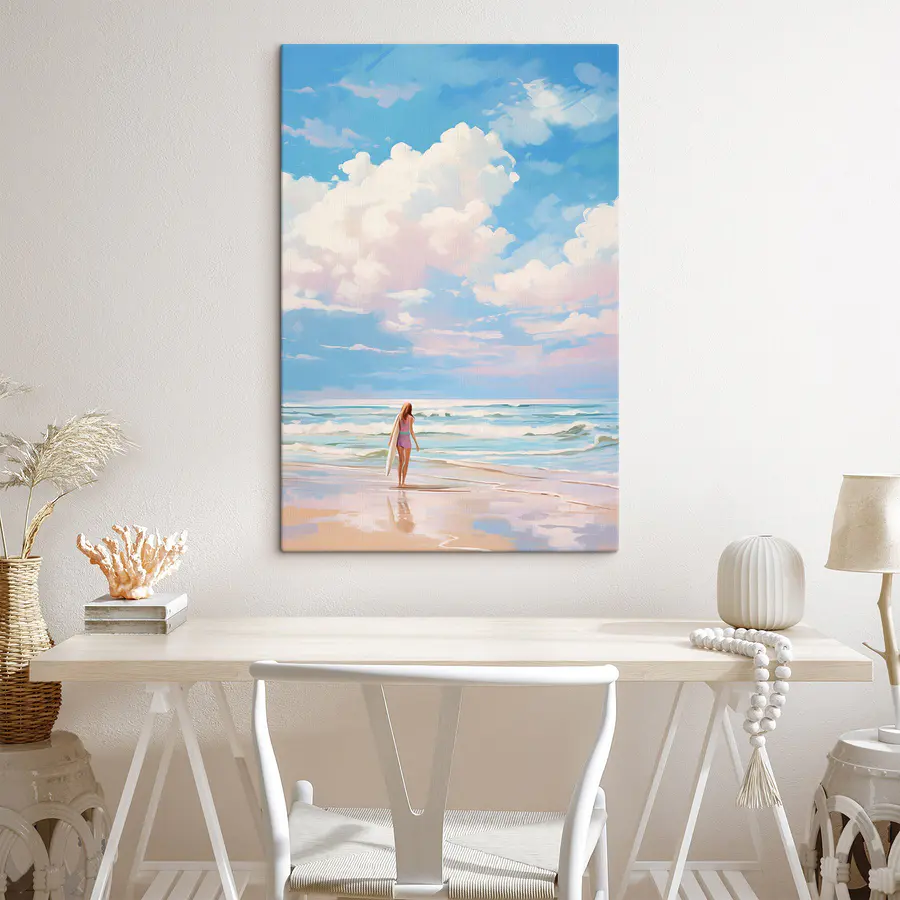 Stel je voor: de zon verwarmt je huid, het geluid van beukende golven vult de lucht en daar is een meisje met een surfplank, klaar voor een avontuur. Deze canvasprint vangt die zalige strandsfeer. Het is als een venster naar het paradijs aan je muur. De zachte blauwtinten en zachte wolken trekken je naar binnen en geven elke kamer een luchtig en ontspannen gevoel. Stel je voor dat je een bijeenkomst organiseert en dat je gasten alleen maar kunnen dagdromen over zandstranden en zomerplezier. Het is meer dan een decor; het is een herinnering aan die zonnige dagen. Perfect om elke hoek op te fleuren – wie wil er nu niet een vleugje oceaan in zijn leven?