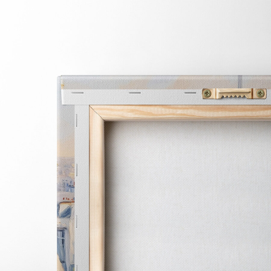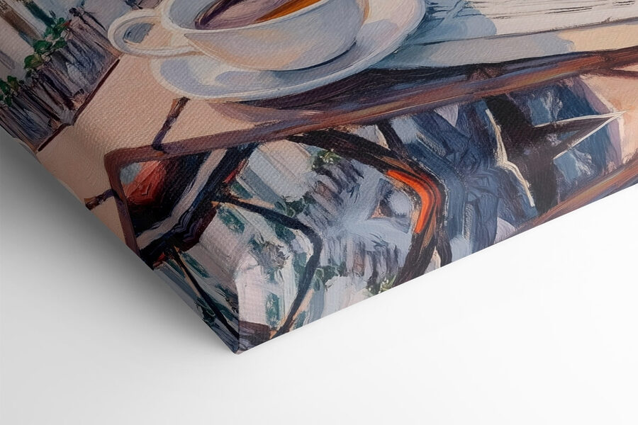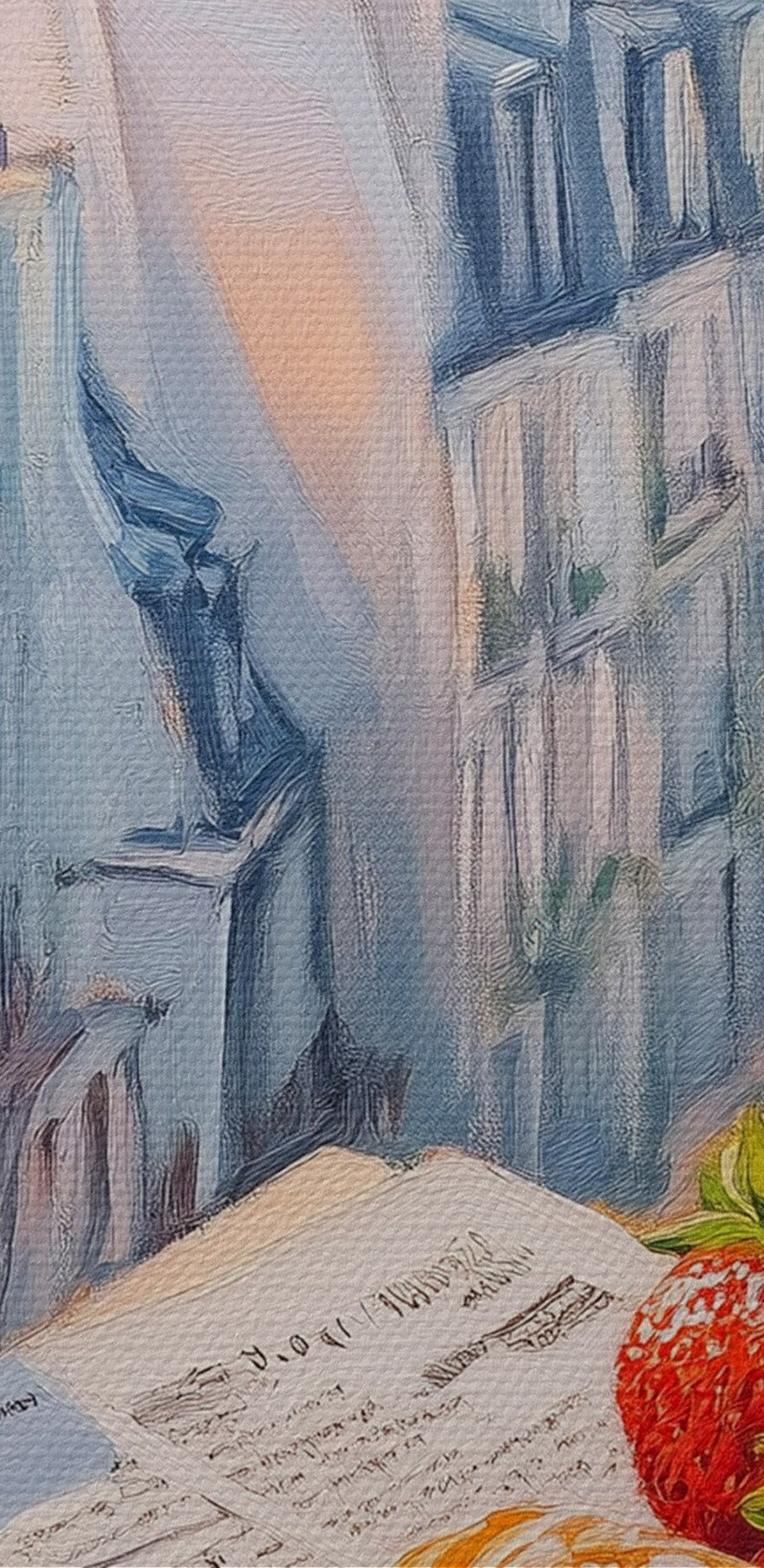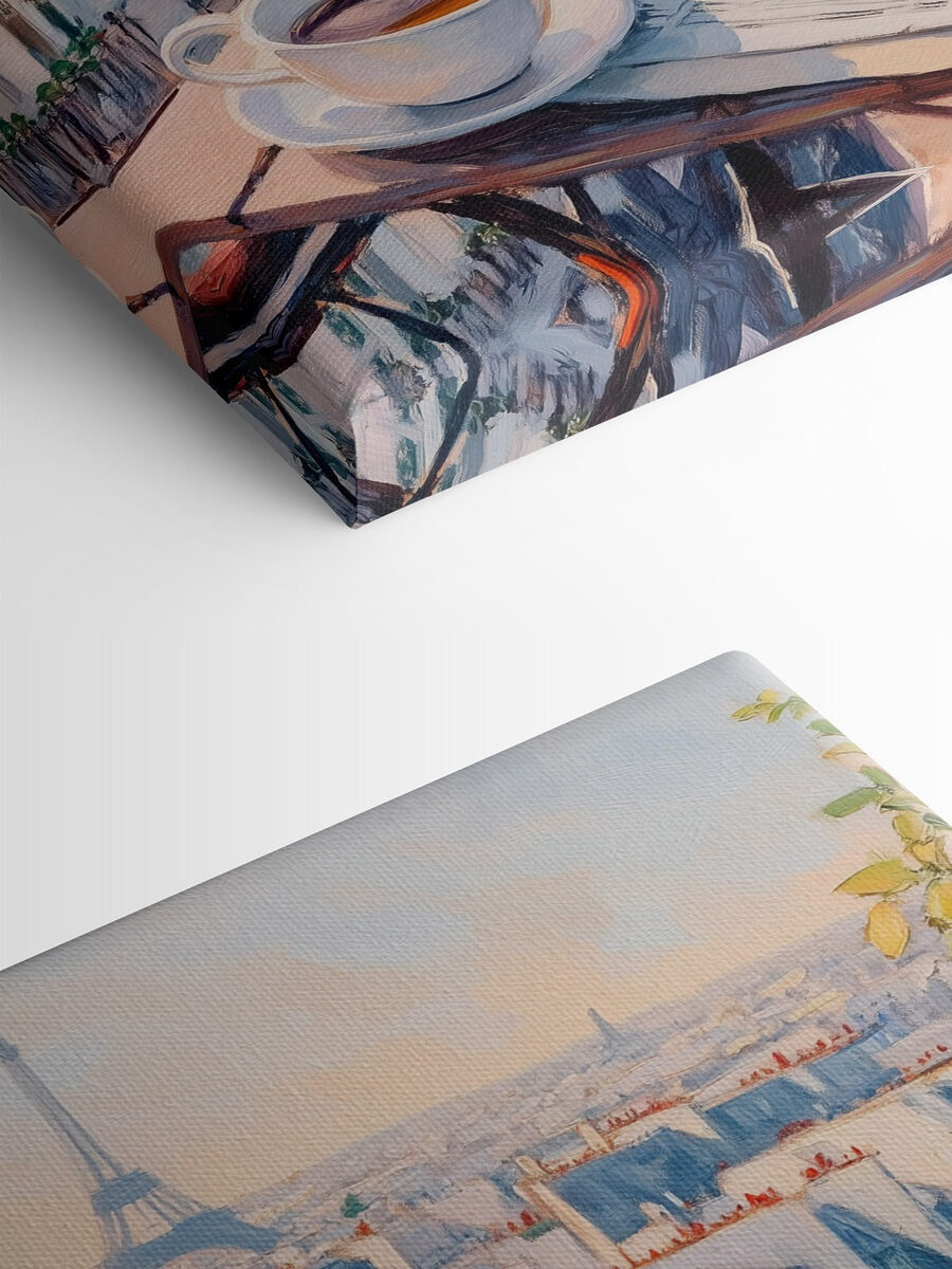 Stel je voor dat je je dag begint met een adembenemend uitzicht. Deze canvasprint toont een gezellig ontbijttafereel met een dampende kop koffie naast een flaky croissant en sappige aardbeien, omlijst door charmante Parijse daken. Het is alsof je wordt meegenomen naar een zonovergoten balkon, waar de drukte van de stad vervaagt. De zachte kleuren en uitnodigende sfeer moedigen aan tot dagdromen – wie wil er nu geen koffie drinken in die serene sfeer? Perfect voor keukens of eethoeken, dit meubel voegt warmte en een vleugje reislust toe aan elke ruimte. Pak een stukje van die magie en laat je muren een verhaal vertellen!