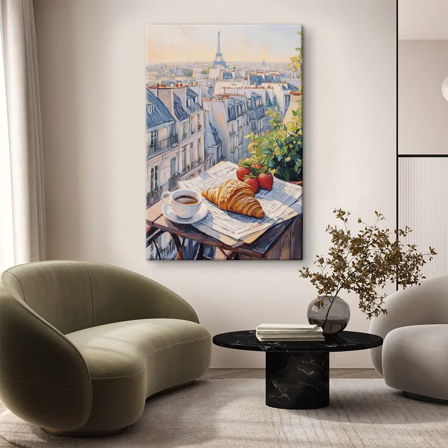 Stel je voor dat je je dag begint met een adembenemend uitzicht. Deze canvasprint toont een gezellig ontbijttafereel met een dampende kop koffie naast een flaky croissant en sappige aardbeien, omlijst door charmante Parijse daken. Het is alsof je wordt meegenomen naar een zonovergoten balkon, waar de drukte van de stad vervaagt. De zachte kleuren en uitnodigende sfeer moedigen aan tot dagdromen – wie wil er nu geen koffie drinken in die serene sfeer? Perfect voor keukens of eethoeken, dit meubel voegt warmte en een vleugje reislust toe aan elke ruimte. Pak een stukje van die magie en laat je muren een verhaal vertellen!