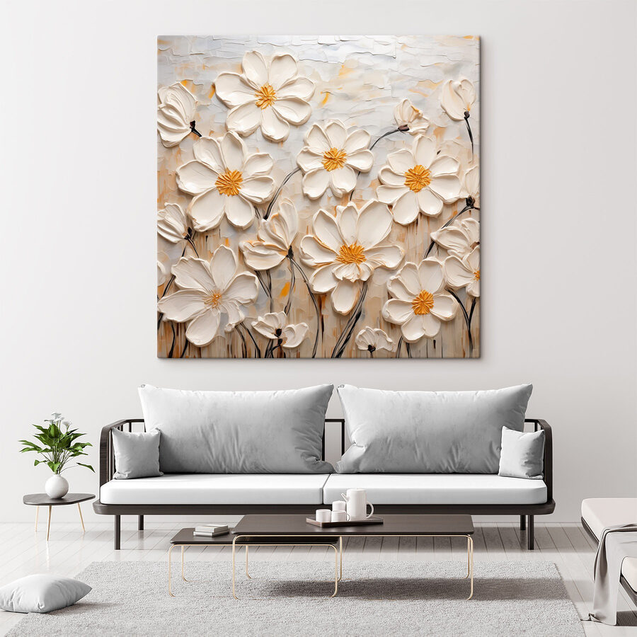 Breng een frisse wind in elke kamer met deze prachtige canvasprint van witte bloemen. Stel je voor dat je wakker wordt met deze bloemen die je ruimte opvrolijken, als een vrolijke tuin die wacht om troost te bieden. De zachte tinten en speelse texturen creëren een knusse sfeer, perfect om ‘s ochtends aan je koffie te nippen of na een lange dag tot rust te komen. Het is alsof je een stukje natuur aan je muur hebt hangen, dat uitnodigt tot warmte en plezier. Vrienden zullen je zeker vragen waar je zo’n charmant stuk hebt gevonden. Het is als een geheim dat je doet glimlachen telkens als je er een glimp van opvangt. Mis de kans niet om een vleugje geluk aan je inrichting toe te voegen!