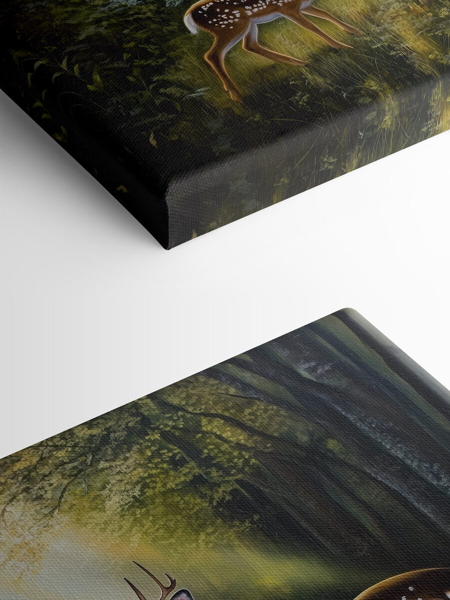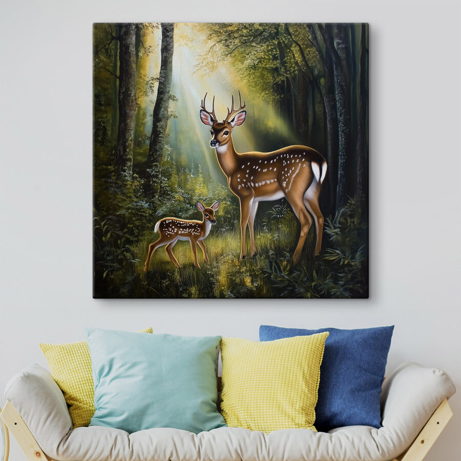 Transformeer je ruimte met deze betoverende canvasprint, “Deer in the Woods”. Zie het voor je: twee sierlijke herten in een zonovergoten bos, die een gevoel van rust en inspiratie bij je thuis oproepen. Dit stuk vangt de stille schoonheid van de natuur en is daarom perfect voor elke kamer die hunkert naar een vleugje sereniteit.