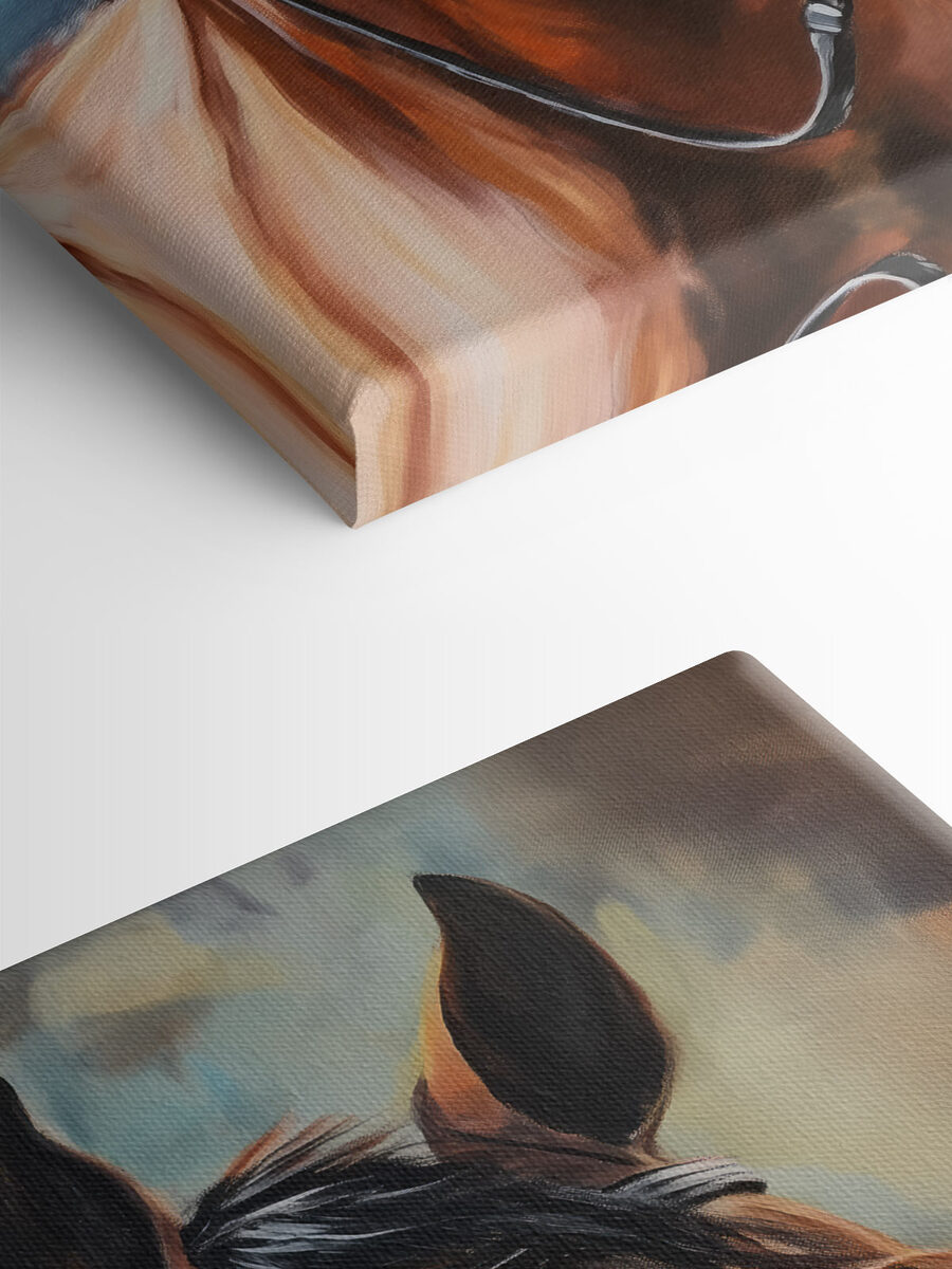 Stel je voor dat je een kamer binnenloopt en begroet wordt door de zielvolle blik van een paard, gevangen in al zijn schoonheid. Deze canvasprint van een paard is niet zomaar kunst; het is een moment bevroren in de tijd, waar elegantie en kracht elkaar ontmoeten. Zie het al hangen boven een knusse bank of in een hal, waar het moeiteloos gesprekken op gang brengt. De warme tinten trekken je aan en nodigen je bijna uit om te dromen van weidse velden en galopperende avonturen. Het is het soort stuk dat een gevoel van rust en een vleugje wilde geest in je ruimte brengt. Perfect voor dierenliefhebbers of iedereen die gewoon houdt van een prachtig decor dat levendig aanvoelt.