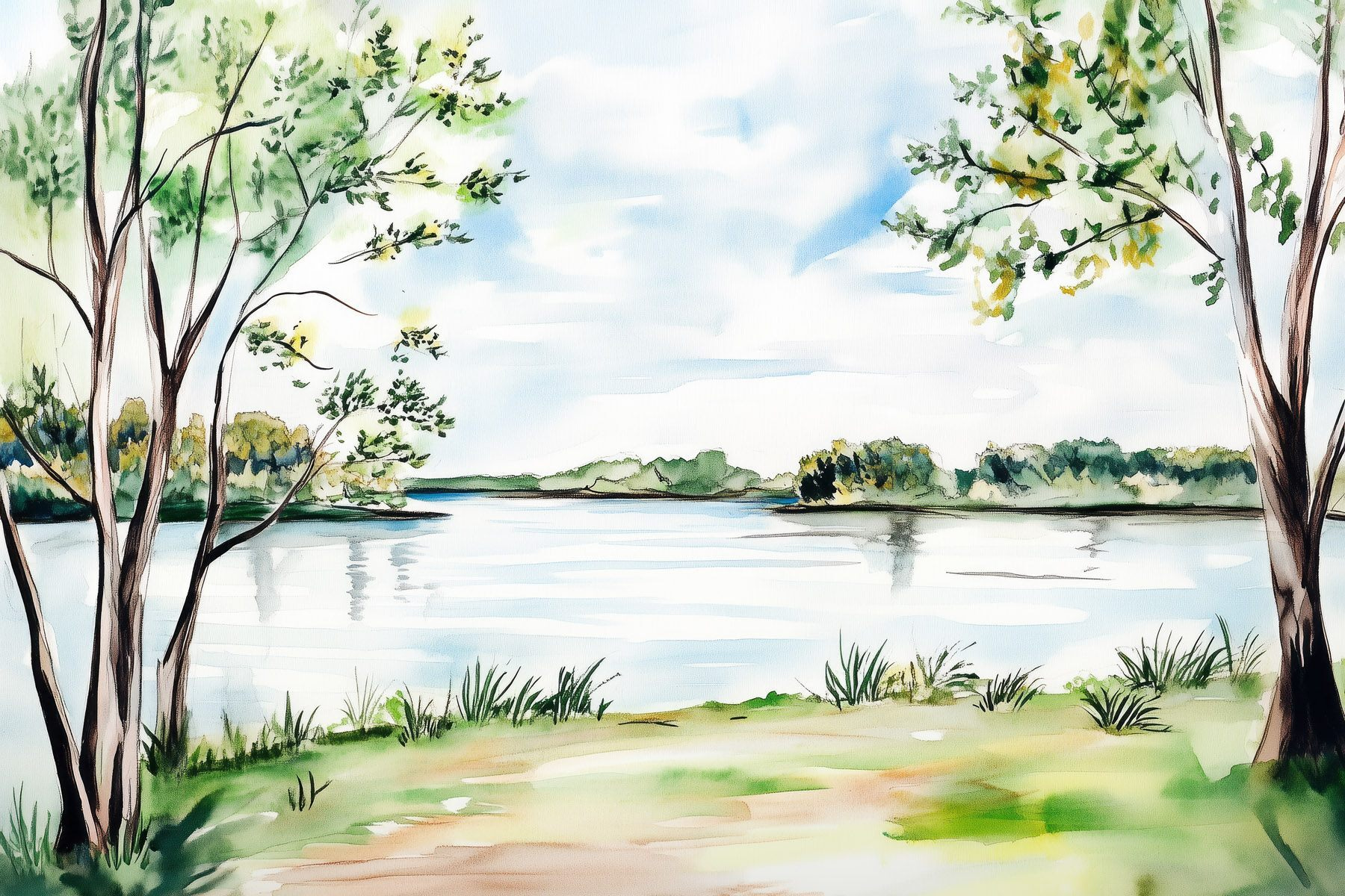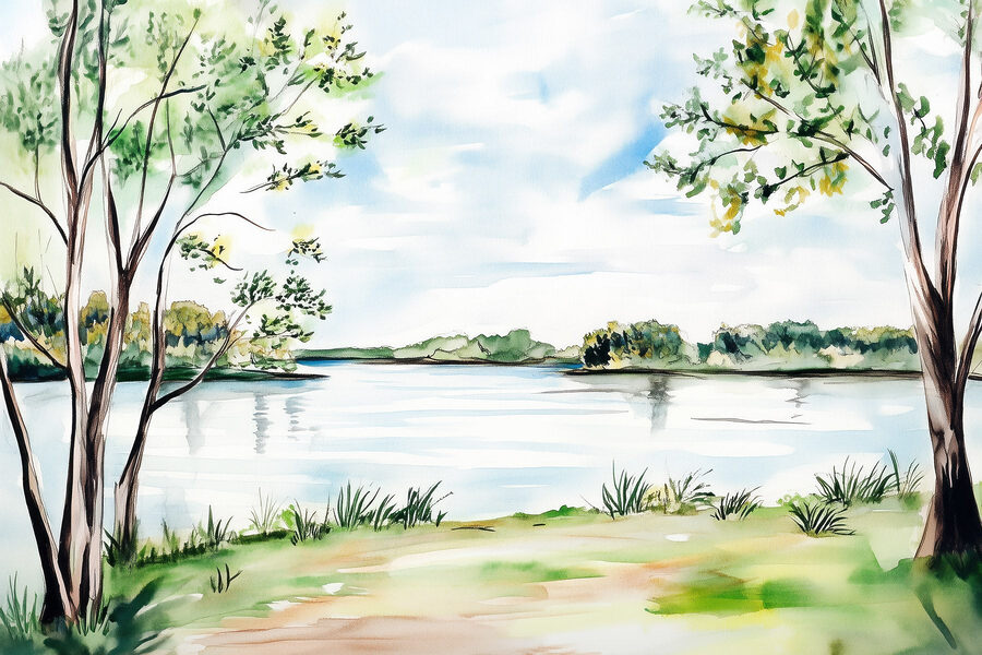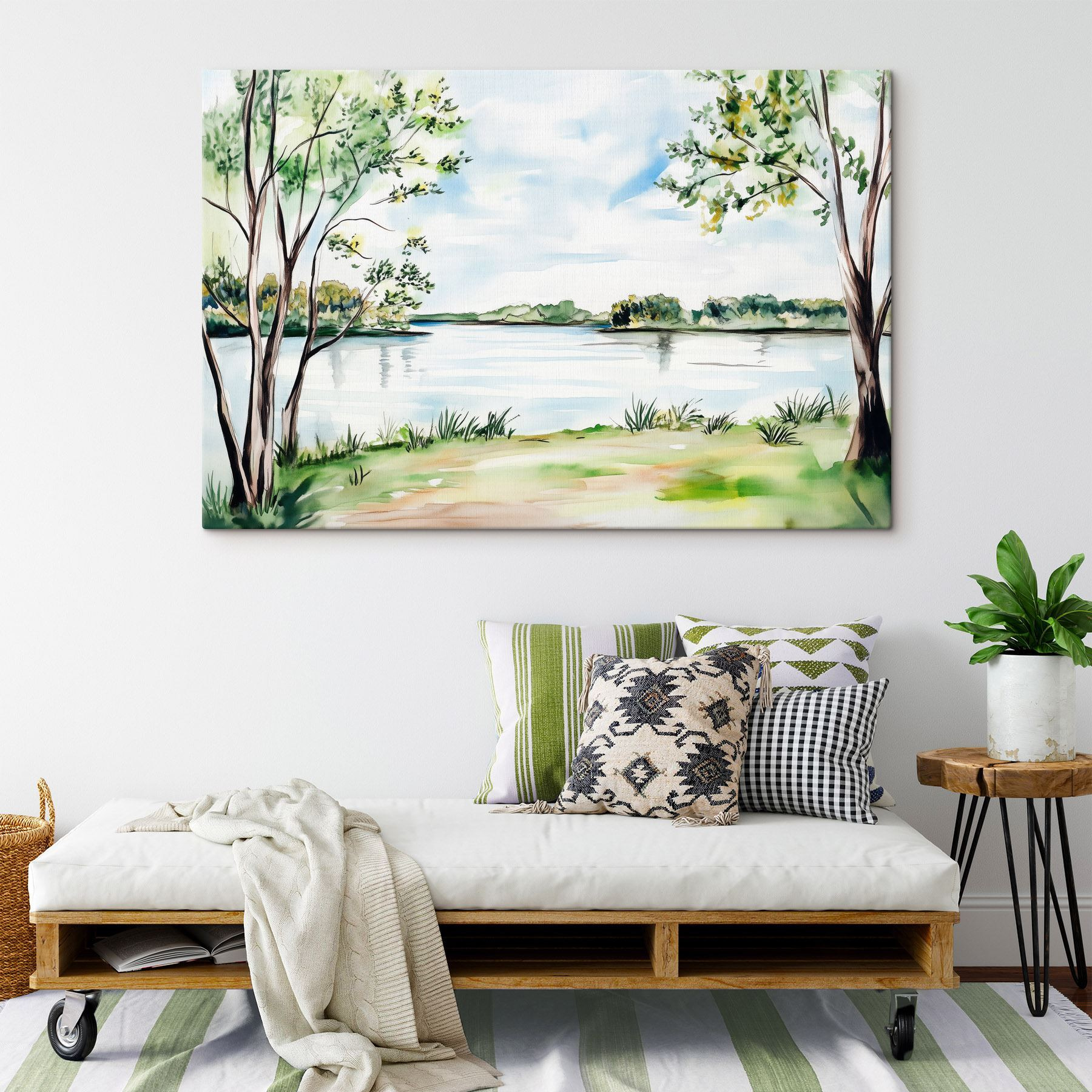 Stel je voor dat je in een vredig landschap stapt telkens als je langs deze canvasprint loopt. Met zachte waterverfstreken die een sereen meer vastleggen, omringd door zachte bomen en gras, brengt het een frisse wind in je huis. Dit kunstwerk is niet zomaar een decoratie; het fluistert verhalen van stille middagen aan het water, waar de enige geluiden ritselende bladeren en af en toe vogelgezang zijn. Perfect voor een gezellig leeshoekje of een rustgevende woonkamer, het nodigt uit tot warmte en rust. Verander je ruimte in een stukje natuur, want wie wil er nu niet dagelijks ontsnappen?