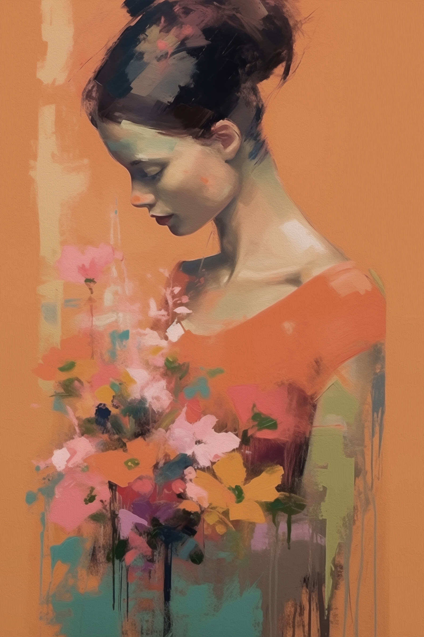 Op deze fascinerende canvasprint staat een vrouw die een boeket bloemen vasthoudt en een sfeer uitstraalt die zowel sereen als vrolijk is. De warme kleuren roepen een gevoel van rust op, waardoor het een perfecte plek is om te dagdromen. Stel je voor dat je een kamer binnenloopt en begroet wordt door dit prachtige stuk, dat de ruimte onmiddellijk transformeert. Het is als een zachte herinnering om even te stoppen en aan de bloemen te ruiken, al is het maar in gedachten. Dit kunstwerk is ideaal voor een gezellig hoekje of een trendy galeriemuur en voegt een vleugje vreugde toe waar het ook hangt. Het zal gasten zeker doen glimlachen en gesprekken op gang brengen.