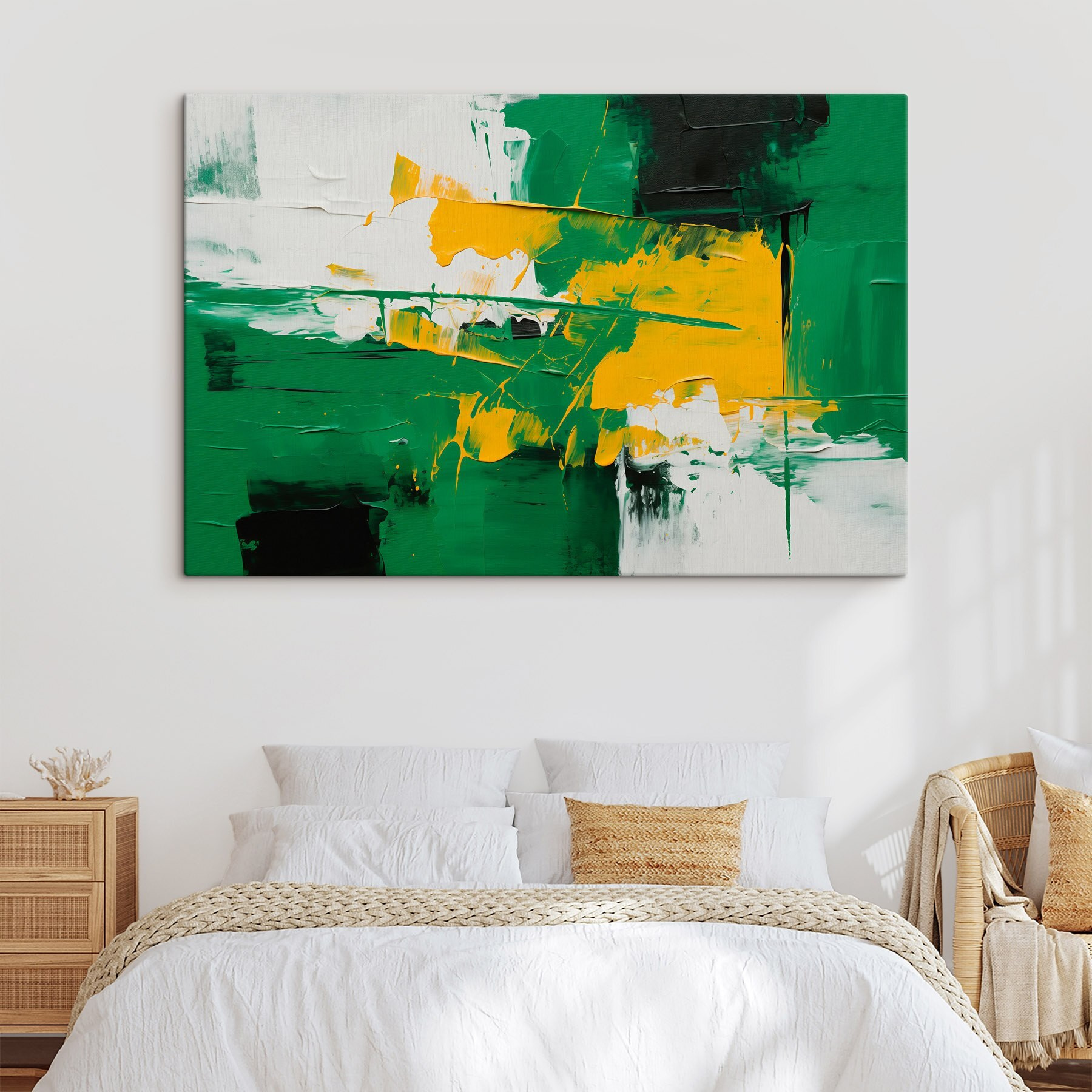 Duik in een vleugje creativiteit met deze levendige canvasprint, waar groen en geel samen dansen in een abstracte symfonie. Stel je voor dat het in je woonkamer hangt en meteen de stemming verhoogt, als een uitbarsting van zonneschijn op een bewolkte dag. Dit stuk is niet alleen kunst, het is een uitnodiging voor een gesprek, een achtergrond voor koffiekletsjes of gezellige avonden. Stel je voor dat je er naar kijkt en de energie voelt verschuiven, terwijl de kleuren vreugde en inspiratie opwekken. Het is perfect voor mensen die hun ruimte graag fris en levendig houden. Hang het op en laat de goede vibes rollen!