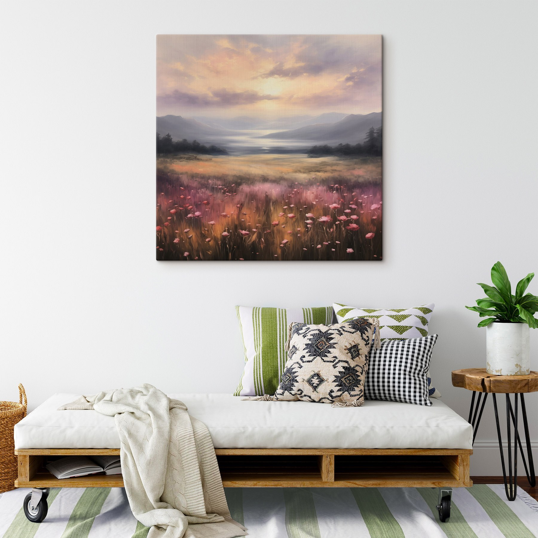 Stel je voor dat je in een wereld stapt waar levendige bloemen dansen in de wind, omlijst door majestueuze bergen. Deze canvasprint is niet zomaar een decoratie; het is een kleine ontsnapping aan je muur. Het boeket van kleuren en het serene landschap nodigen uit tot dagdromen over luie middagen en rustige wandelingen. Stel je deze schoonheid voor in een gezellig hoekje of boven een leeshoekje, waar je elke keer dat je langsloopt blij van wordt. Het is alsof je een tuin in huis haalt zonder de gieter of het vervelende onkruid. Perfect voor wie houdt van de charme van de natuur, met een vleugje gelukzaligheid en verwondering!