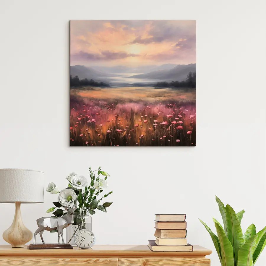 Stel je voor dat je in een wereld stapt waar levendige bloemen dansen in de wind, omlijst door majestueuze bergen. Deze canvasprint is niet zomaar een decoratie; het is een kleine ontsnapping aan je muur. Het boeket van kleuren en het serene landschap nodigen uit tot dagdromen over luie middagen en rustige wandelingen. Stel je deze schoonheid voor in een gezellig hoekje of boven een leeshoekje, waar je elke keer dat je langsloopt blij van wordt. Het is alsof je een tuin in huis haalt zonder de gieter of het vervelende onkruid. Perfect voor wie houdt van de charme van de natuur, met een vleugje gelukzaligheid en verwondering!