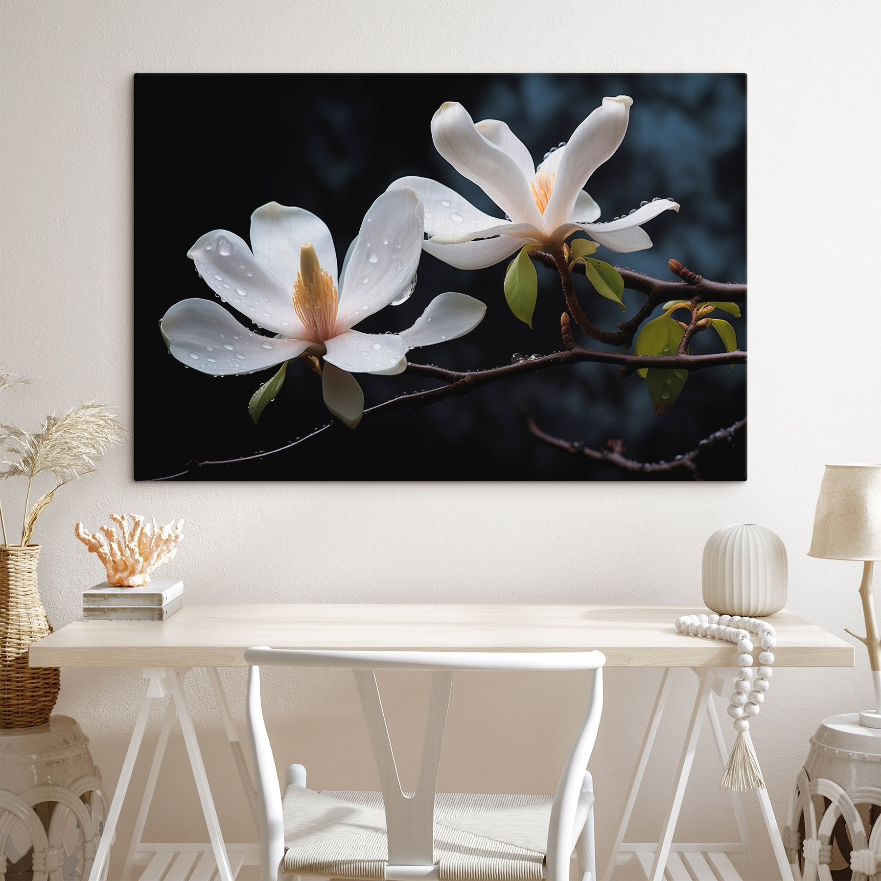 Transformeer je ruimte met de serene schoonheid van “Zachte bloemblaadjes versierd met waterdruppels”. Dit doek vangt de delicate charme van bloesems, elk bloemblaadje gekust door zachte regendruppels. Stel je voor dat je langsloopt en een kleine opkikker in je hart voelt als je dit rustige kunstwerk ziet. Het brengt een gevoel van rust, perfect voor gezellige hoekjes of om een werkruimte op te fleuren. Elke blik kan dagdromen opwekken van luie tuinwandelingen of serene, met regen doordrenkte ochtenden. Het is niet alleen decor; het is een eenvoudige herinnering aan de stille wonderen van de natuur, klaar om leven te blazen in je muren.