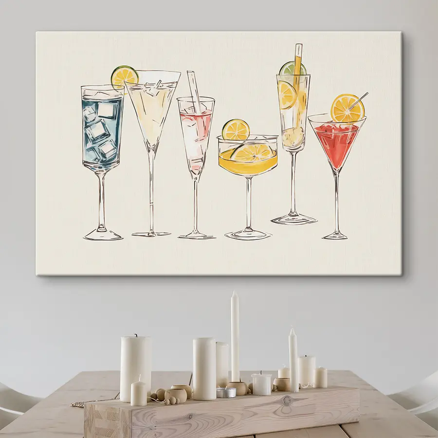 Fleur elke ruimte op met deze speelse canvasprint met een rij kleurrijke drankjes die er gewoon om smeken om genipt te worden. Stel je voor dat je thuis ontspant, een blik werpt op dit vrolijke kunstwerk en je een beetje gelukkiger voelt. Elk glas vertelt zijn eigen verhaal, van het verfrissende blauw met ijsblokjes dat zomer schreeuwt tot de pittige gele cocktail die zelfs een saaie dag kan opfleuren. Perfect voor keukens of bars, het voegt een vleugje plezier en een vleugje eigenzinnigheid toe. Vrienden zullen deze unieke touch zeker opmerken en wie weet kan het een levendig gesprek op gang brengen. Proost op een heerlijke decorkeuze!