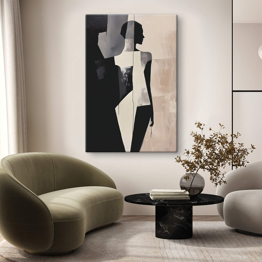 Stel je voor dat je een kamer binnenloopt en begroet wordt door een gracieus silhouet, gevangen in een tijdloze houding die zowel modern als nostalgisch aanvoelt. Deze canvasprint, met een vrouw in een vloeiende jurk, brengt een vleugje elegantie in elke ruimte. Het zachte contrast van de kleuren trekt je naar binnen, bijna als een zachte omhelzing, terwijl de abstracte vormen de verbeelding prikkelen. Het is perfect om gesprekken op gang te brengen of gewoon een lege muur te vullen die om aandacht vraagt. Het is niet alleen decor; het is een sfeer die uitnodigt tot rust en creativiteit. Hang het in de woonkamer of een gezellig hoekje en laat de subtiele charme het werk doen. Wie wil er nu geen dagelijkse herinnering aan schoonheid in zijn kamer? Stel je de verhalen eens voor die het zou kunnen vertellen.