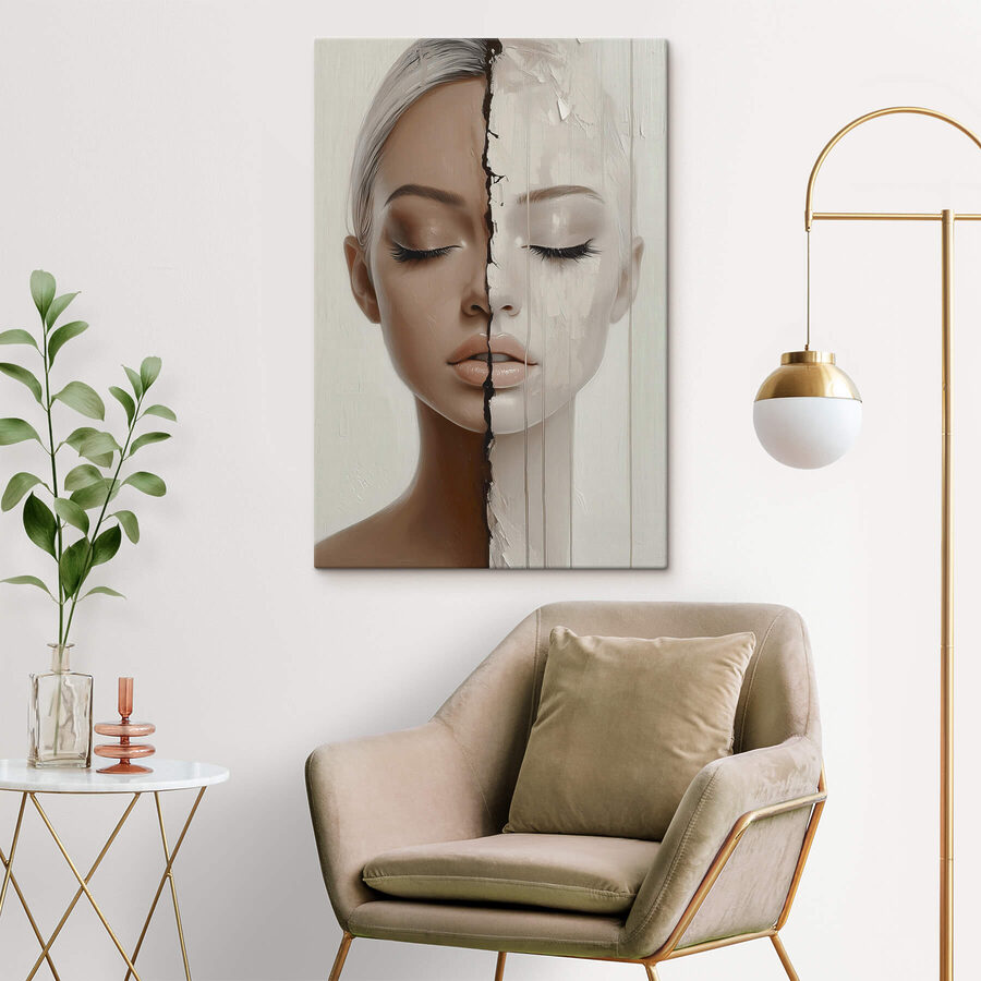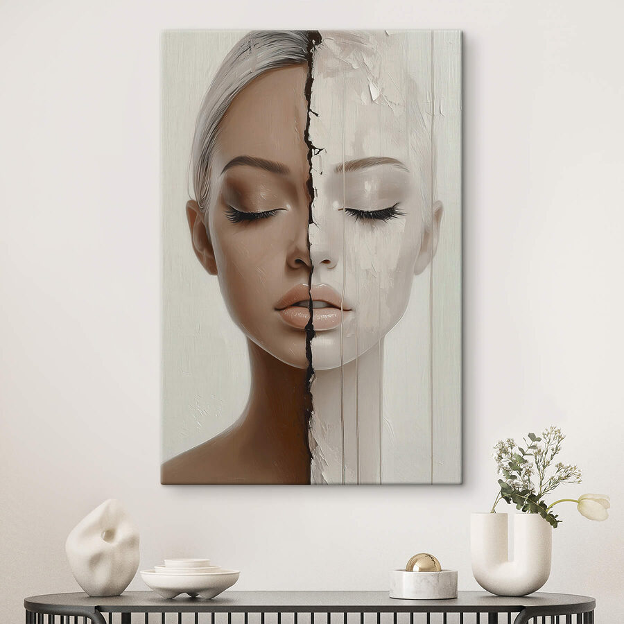Ontdek een fascinerende mix van schoonheid met “Dualiteit van schoonheid en transformatie”. De opvallende afbeelding van deze canvasprint nodigt iedereen die het ziet uit om na te denken over de contrasten van het leven en de reis die we allemaal maken. Stel je voor dat je dit zou ophangen in een gezellige woonkamer of een creatieve werkruimte. Het is het soort kunstwerk dat gesprekken op gang brengt en de verbeelding aan het rollen brengt. De ingewikkelde details creëren lagen van emotie, met een balans tussen kracht en kwetsbaarheid. Laat het inspireren tot momenten van reflectie en ons eraan herinneren dat schoonheid in evolutie ligt. Perfect voor diegenen die hunkeren naar een uniek tintje in hun inrichting.
