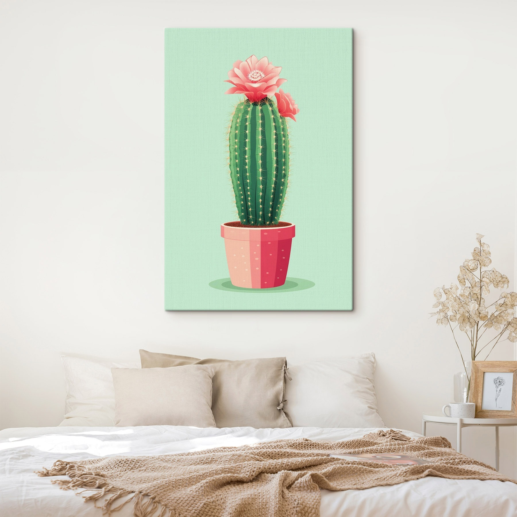 Breng leven in de brouwerij met deze vrolijke canvasprint van een bloeiende cactus. Stel je voor: een grote, stekelige groene vriend die de meest levendige roze bloemen draagt, gewoon van de zon geniet en goede vibraties verspreidt. Het is als een stukje magie van de natuur aan je muur. Of het nu in een gezellige keuken is of in een trendy lounge, dit kunstwerk nodigt uit tot glimlachen en een beetje warmte. Wie wil er nu geen conversatie starter die zegt, “Ja, ik ben verrukkelijk en een beetje uniek”? Perfect voor natuurfans of iedereen die zijn ruimte op een moeiteloos leuke manier wil opvrolijken!