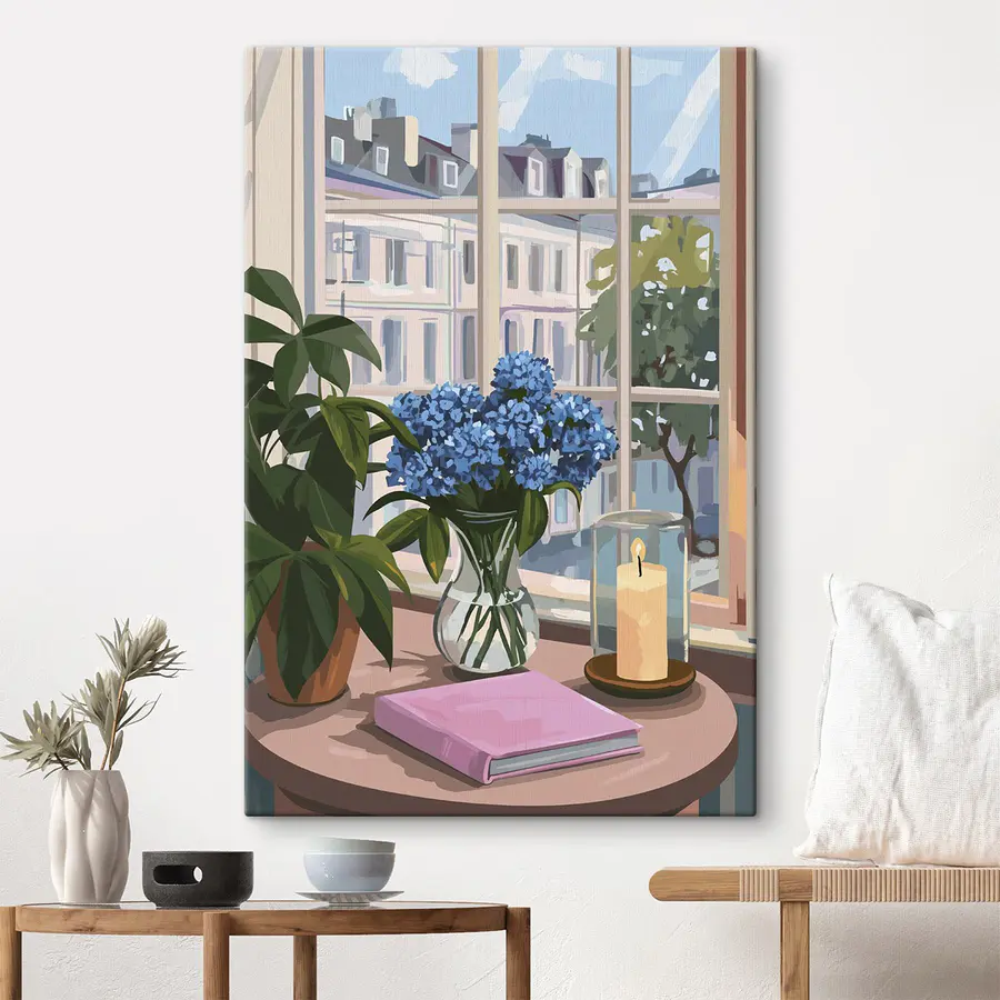 Fleur elke ruimte op met deze prachtige canvasprint met een vaas met levendige blauwe bloemen en een flikkerende kaars, omlijst door de charme van een raam. Stelt u zich eens voor dat u zich oprolt met een warm kopje thee en een zacht briesje voelt terwijl het zonlicht door de kamer danst. Het is alsof je een stukje van een gezellig café in huis haalt. Perfect voor een woonkamer, studeerkamer of zelfs een rustig hoekje waar inspiratie stroomt. Voeg dit stuk toe en laat de vreugde van verse bloemen en kaarslicht enkele mooie momenten in het dagelijks leven aanwakkeren.