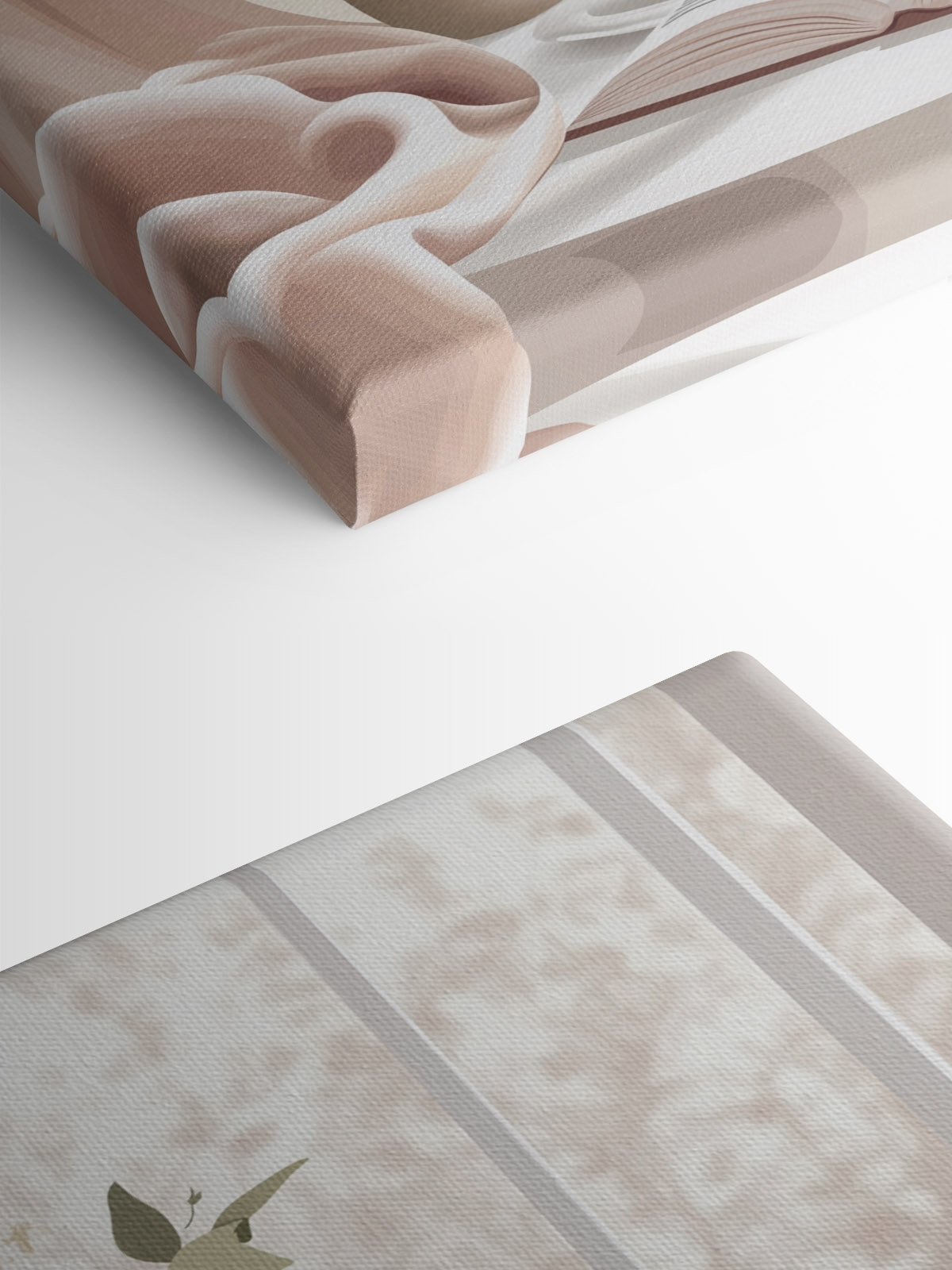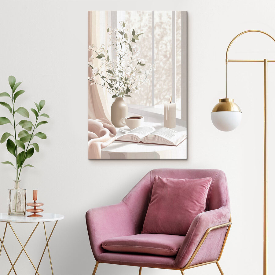 Transformeer elke hoek van je huis met deze charmante canvasprint met een gezellig kopje koffie en een delicate vaas met bloemen op een zonovergoten vensterbank. Dit kunstwerk heeft een serene sfeer, perfect voor het creëren van een rustig toevluchtsoord. Stel je voor dat je lekker wegkruipt met een goed boek, nippend aan je favoriete brouwsel, terwijl de zon door de zachte gordijnen schijnt. Het minimalistische ontwerp brengt een vleugje natuur in, waardoor het voelt alsof je in een dromerig café of een vredig tuinhoekje woont. Ideaal om tot rust te komen of om vreugde op te wekken, dit stuk is als een warme knuffel voor je muren.