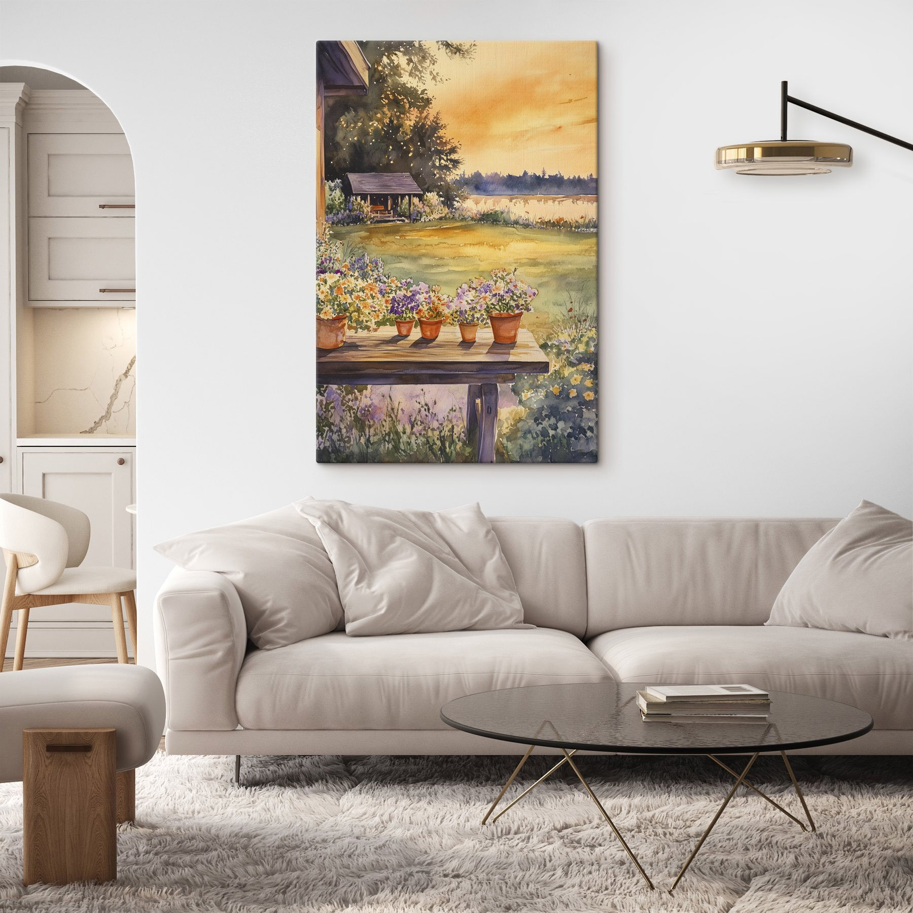 Tover een muur om in een uitnodigend toevluchtsoord met deze betoverende aquarelprint van een veranda versierd met levendige bloemen in potten. Stel je voor: een zachte zonsondergang met warme tinten terwijl je aan je favoriete drankje nipt en de zachte bries voelt. De levendige kleuren van de bloemen nodigen uit tot glimlachen en gesprekken, waardoor het een mooie aanvulling is voor gezellige hoekjes of om een minder spannend hoekje op te fleuren. Stel je voor dat je gasten langslopen en het serene tafereel bewonderen, verdwaald in gedachten van warme zomeravonden. Het is niet zomaar decoratie; het is een stukje gelukzaligheid.