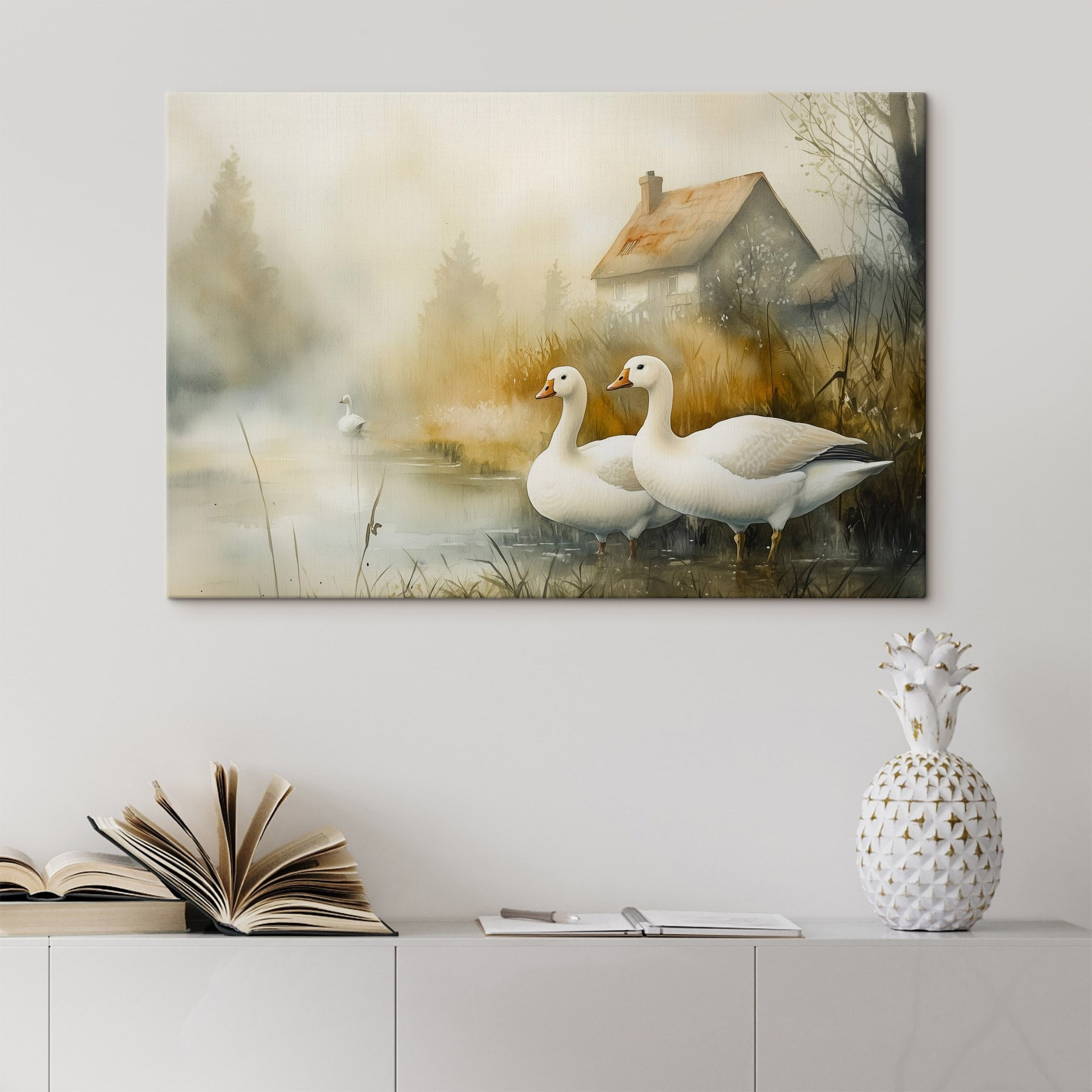 Stel je voor dat je je ruimte verandert in een serene ontsnapping met deze aquarelafdruk van ganzen die gracieus luieren bij een rustige vijver. Het is als een frisse wind! De zachte, gedempte tinten nodigen uit tot rust en zijn perfect om een woonkamer op te fleuren of een gezellig hoekje te creëren. Stel je voor dat je lekker gaat liggen met een boek in de buurt, een blik werpt op de kunst en een golf van rust voelt. Het is het soort kunstwerk dat je aanzet tot dagdromen. Misschien ga je zelfs wel een tuintje aanleggen of dagdromen over het platteland. Ga je gang, laat deze ganzen het charmante middelpunt zijn dat je hart verwarmt en je stemming verlicht.