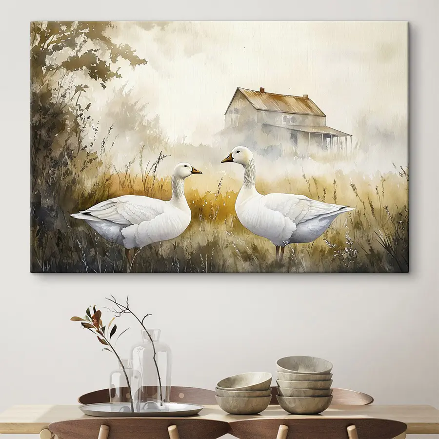 Stel je twee ganzen voor die samen in een sereen veld staan en rustig een praatje maken, terwijl de natuur fluistert op de achtergrond. Deze aquarelafdruk legt die perfecte kalmte vast, waardoor het een charmante toevoeging is aan elke ruimte. De zachte kleuren creëren een gezellige sfeer, perfect voor een woonkamer of een hal. Het is alsof je een stukje natuur in huis haalt zonder de modder! Stel je voor dat je aan een kopje thee nipt en geniet van het uitzicht – deze gevederde vrienden kunnen zelfs een glimlach op je gezicht toveren. Perfect voor dierenliefhebbers of iedereen die een vleugje rustige schoonheid wil toevoegen aan zijn inrichting. Het is schattig, boeiend en o zo vredig.