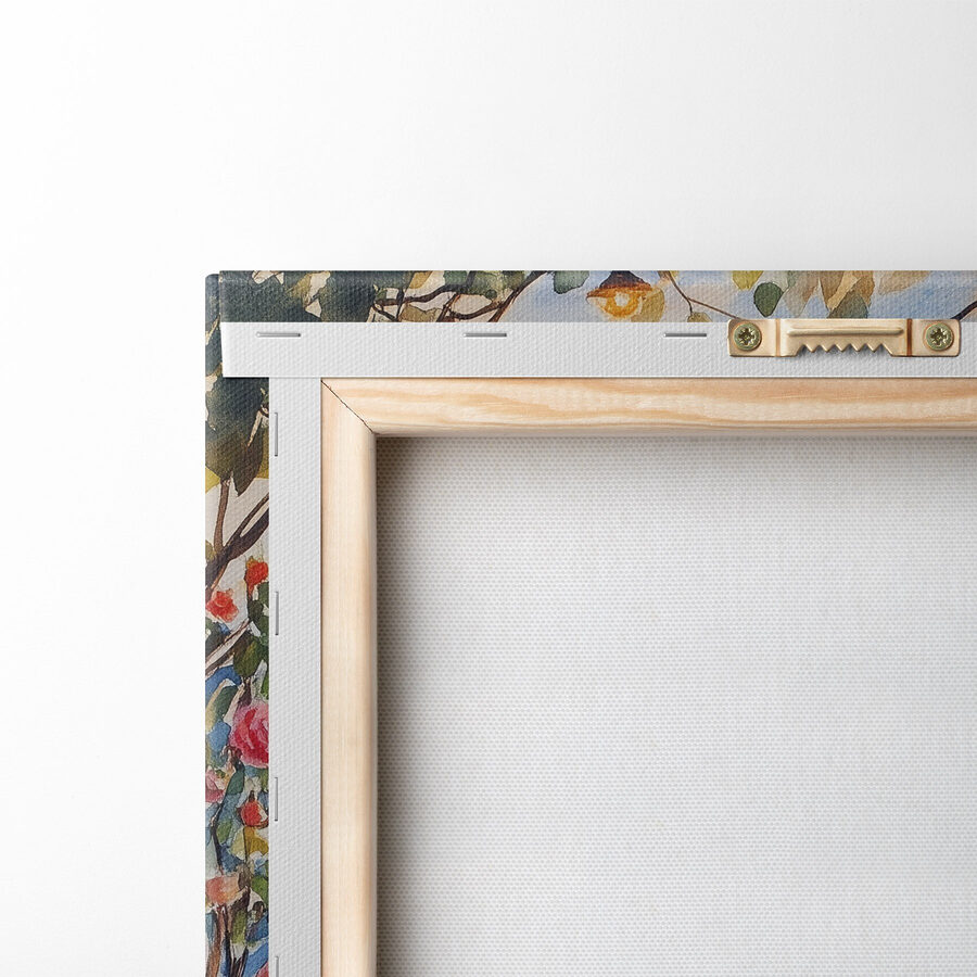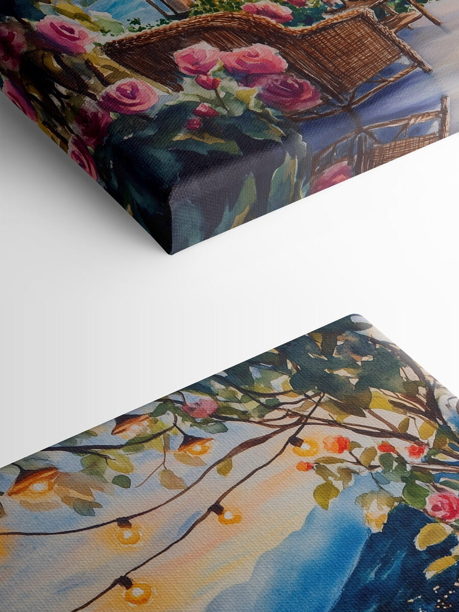 Stel je voor dat je je woonkamer binnenstapt en wordt meegevoerd naar een gezellig terras met uitzicht op een glinsterend meer. Deze canvasprint is je ticket naar die dromerige ontsnapping. Met zachte, vloeiende aquarellen brengt het een scène tot leven vol bloeiende rozen en twinkelende lichtjes die lijken te dansen in de lucht. Stel je avonden voor die je doorbrengt terwijl je thee drinkt of geheimen deelt onder de sterren, allemaal vanuit het comfort van je eigen huis. Het is alsof je je eigen stukje paradijs hebt, dat je eraan herinnert om het wat rustiger aan te doen en te genieten van die eenvoudige, mooie momenten. Perfect om vreugde en warme gesprekken te stimuleren.