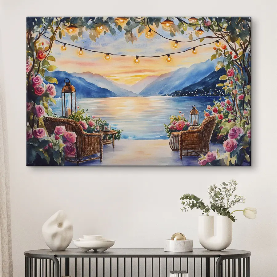 Stel je voor dat je je woonkamer binnenstapt en wordt meegevoerd naar een gezellig terras met uitzicht op een glinsterend meer. Deze canvasprint is je ticket naar die dromerige ontsnapping. Met zachte, vloeiende aquarellen brengt het een scène tot leven vol bloeiende rozen en twinkelende lichtjes die lijken te dansen in de lucht. Stel je avonden voor die je doorbrengt terwijl je thee drinkt of geheimen deelt onder de sterren, allemaal vanuit het comfort van je eigen huis. Het is alsof je je eigen stukje paradijs hebt, dat je eraan herinnert om het wat rustiger aan te doen en te genieten van die eenvoudige, mooie momenten. Perfect om vreugde en warme gesprekken te stimuleren.