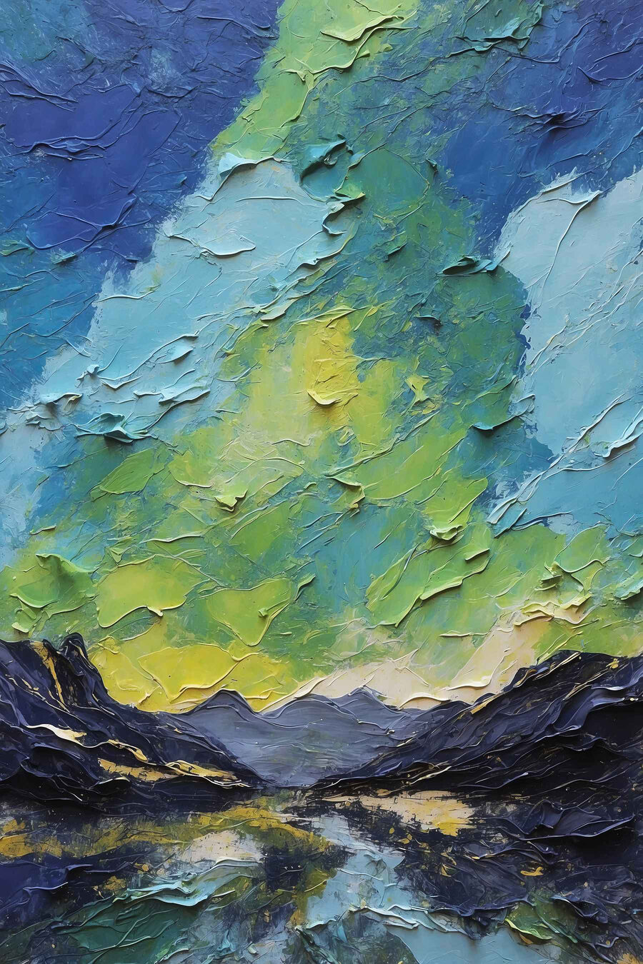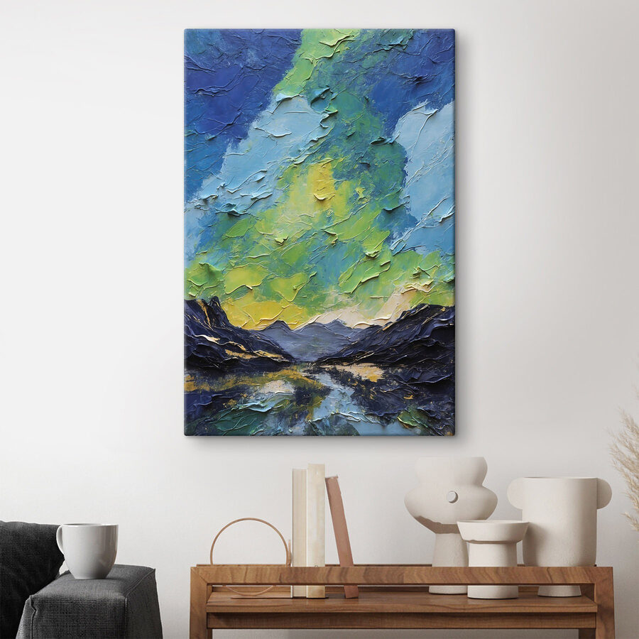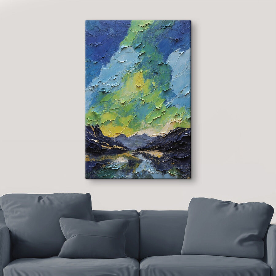Transformeer je kamer met deze levendige canvasprint die de betoverende dans van bergen en wolken vastlegt. Met groene en blauwe wervelingen nodigt het uit tot frisse lucht en rust in elke kamer. Stel je voor dat je ‘s ochtends aan je koffie nipt terwijl je naar dit serene landschap staart en je het gevoel hebt dat je er even helemaal tussenuit bent. Perfect om karakter toe te voegen aan een gezellig hoekje of inspirerend voor de creativiteit in een werkruimte, dit stuk vertelt een verhaal over de schoonheid van de natuur zonder een woord te zeggen. Het is niet alleen kunst; het is een stukje vrede dat staat te gebeuren.