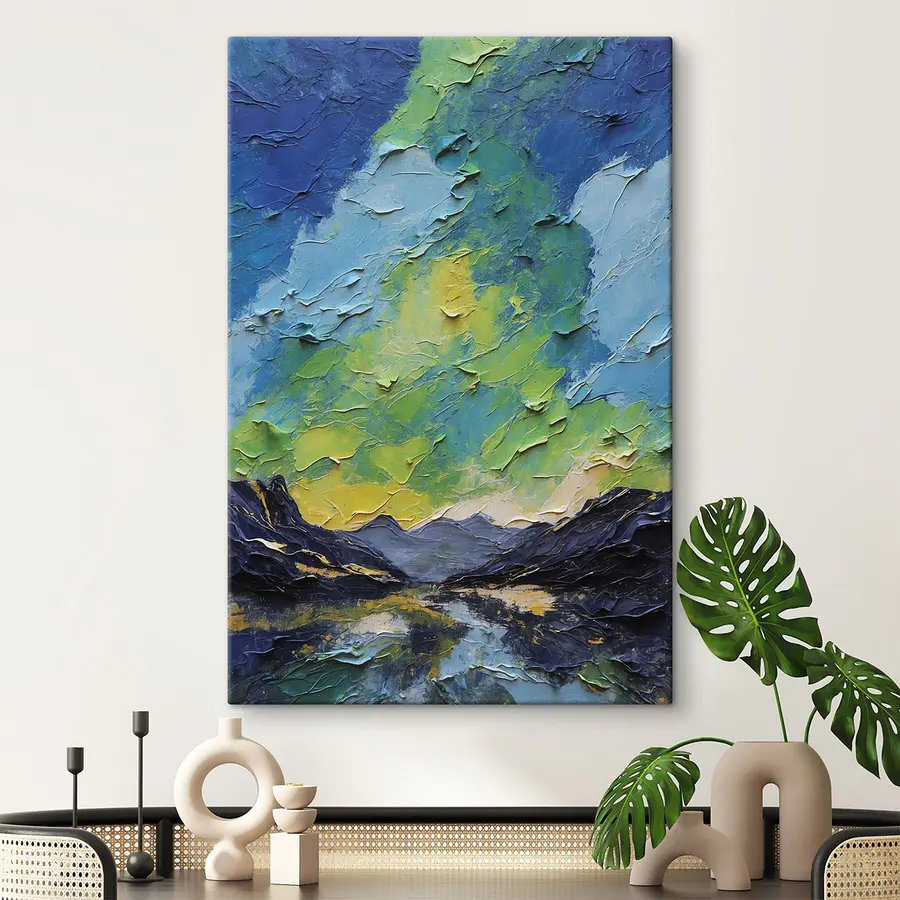 Transformeer je kamer met deze levendige canvasprint die de betoverende dans van bergen en wolken vastlegt. Met groene en blauwe wervelingen nodigt het uit tot frisse lucht en rust in elke kamer. Stel je voor dat je ‘s ochtends aan je koffie nipt terwijl je naar dit serene landschap staart en je het gevoel hebt dat je er even helemaal tussenuit bent. Perfect om karakter toe te voegen aan een gezellig hoekje of inspirerend voor de creativiteit in een werkruimte, dit stuk vertelt een verhaal over de schoonheid van de natuur zonder een woord te zeggen. Het is niet alleen kunst; het is een stukje vrede dat staat te gebeuren.