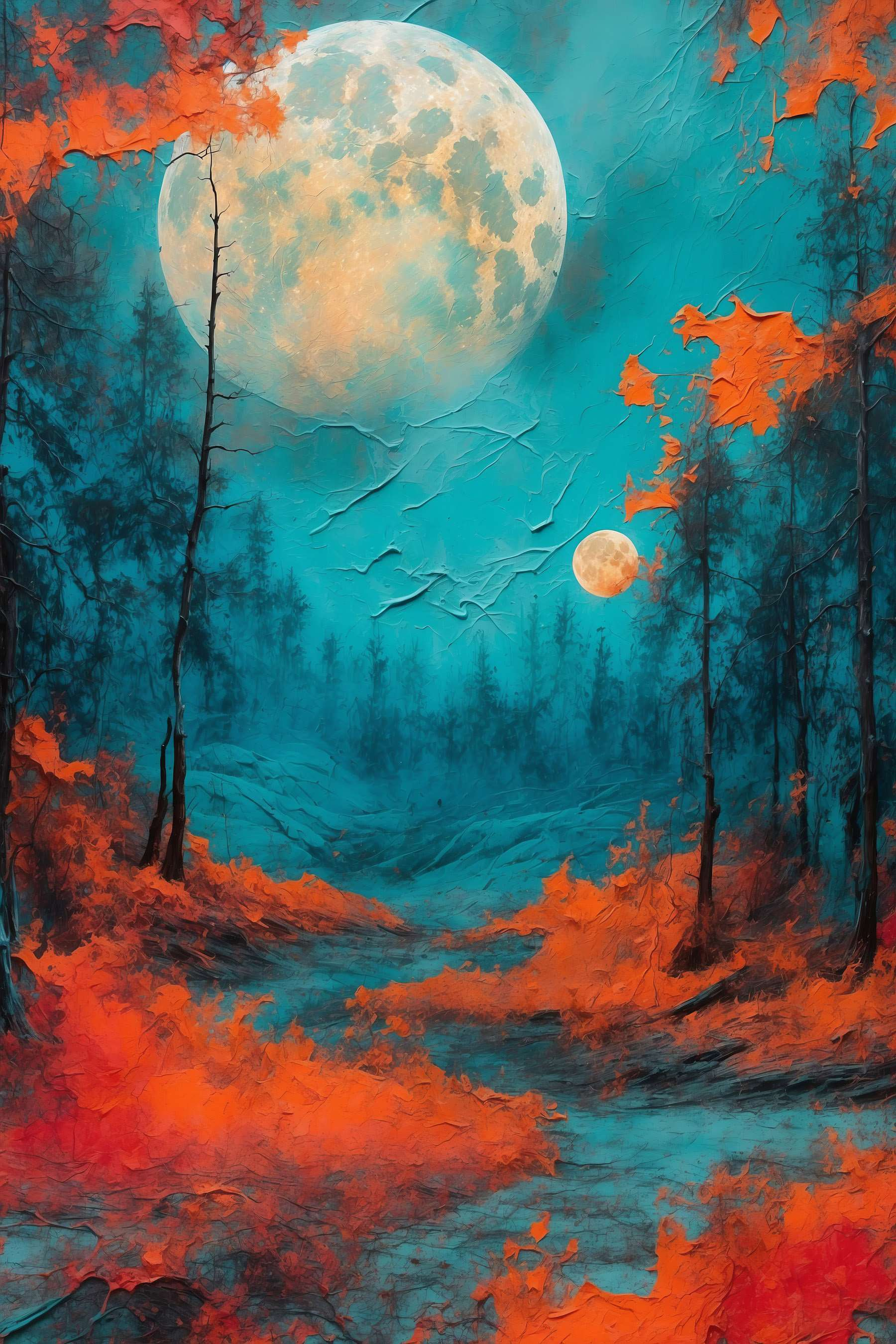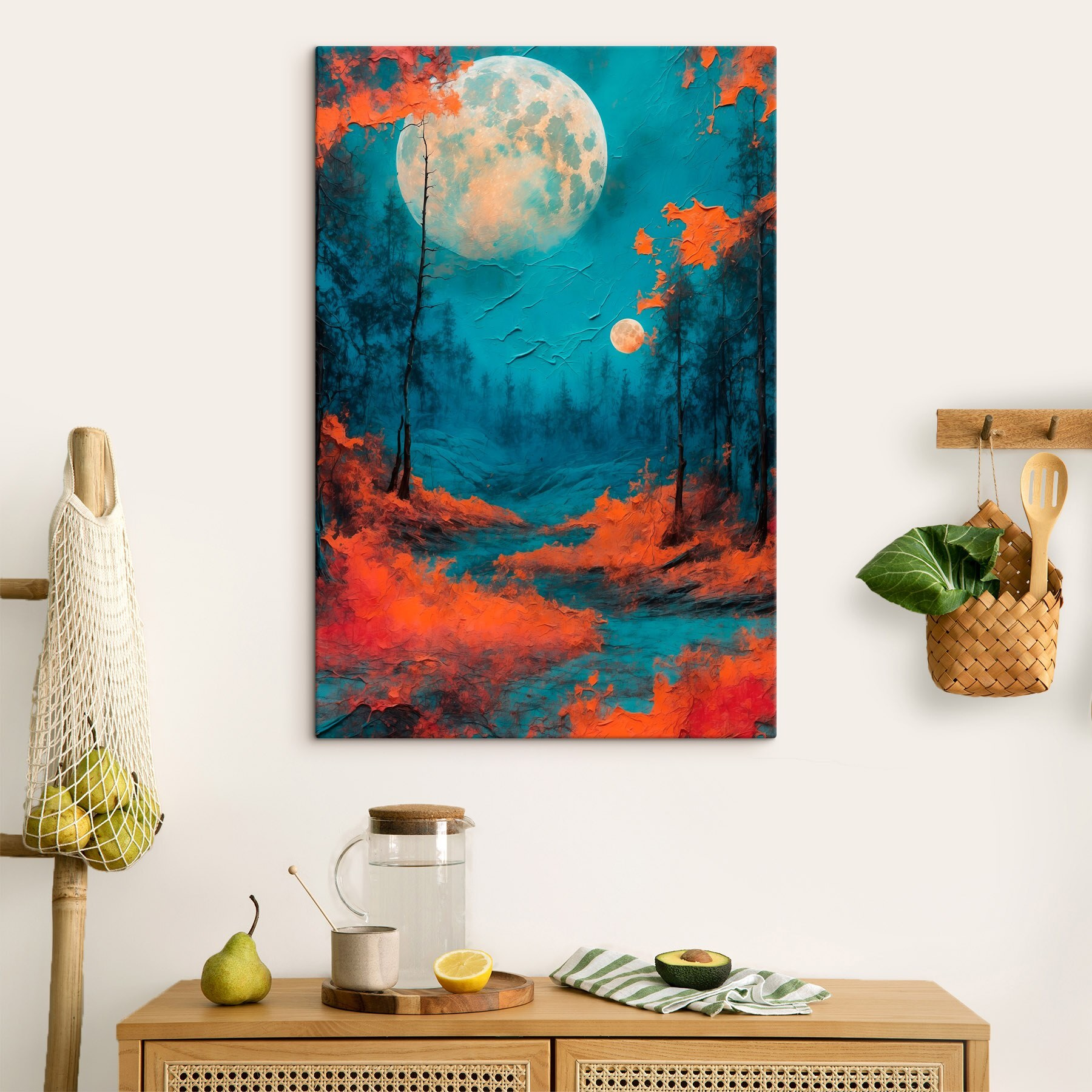 Transformeer elke ruimte met deze prachtige canvasprint van een bos dat baadt in levendige oranje bladeren en een betoverende volle maan. Stel je voor dat je deze betoverende scène binnenstapt, waar de kleuren knallen als een cocktail bij zonsondergang, waardoor elke dag voelt als een avontuur. Het is alsof de natuur zelf heeft besloten een feestje te bouwen. Perfect om een knus hoekje een vleugje persoonlijkheid te geven of een gesprek op gang te brengen in de woonkamer. Dit stuk is niet zomaar kunst; het is een stukje magie dat warmte en verwondering brengt aan elke muur. Stel je de verhalen eens voor die het kan vertellen!