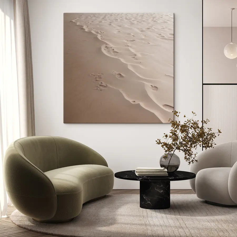 Breng een stukje rust in je interieur met de Canvas Print “Footprints in the Sand”. Stel je voor dat je wegdroomt met je ogen gericht op dit serene tafereel, waar zachte golven zachtjes de kust strelen en een vleugje van de wandeling van gisteren achterlaten. Het is als een warme stranddag die voor altijd is vastgelegd en iedereen eraan herinnert dat het leven draait om de momenten die we achterlaten. Perfect voor dat knusse hoekje waar ontspanning een must is, of als een gespreksonderwerp dat dagdromen inspireert. Een kleine ontsnapping thuis – want wie wil die zanderige bries nu niet voelen terwijl hij van zijn ochtendkoffie nipt?