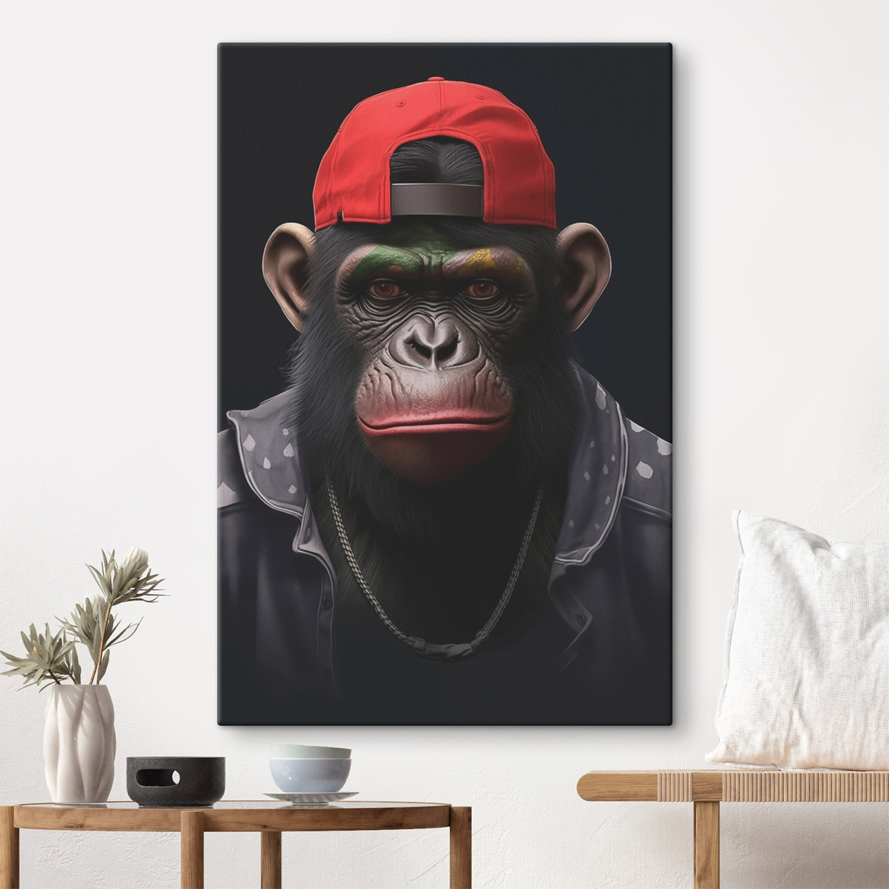 Vrolijk elke kamer op met deze eigenzinnige canvasprint van een coole chimpansee met een rode hoed en jas alsof het de laatste trend is. Stel je voor: een leuke gespreksstarter die ieders aandacht trekt en een glimlach ontlokt als gasten het verhaal van de aap proberen te raden. Is hij op een missie om de beste banaan van de stad te vinden of is hij gewoon aan het vibreren in zijn stijlvolle kleding? Wat het verhaal ook is, dit stuk voegt een vleugje plezier en persoonlijkheid toe aan je kamer. Het is perfect voor woonkamers, kinderkamers of zelfs die hoek van het kantoor die wel wat vrolijkheid kan gebruiken. Wie houdt er nou niet van een chimpansee in straatstijl?
