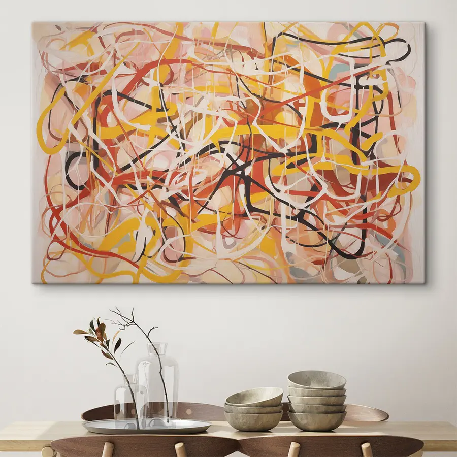 Duik in een draaikolk van kleuren met deze levendige canvasprint! Stel je voor dat je een kamer binnenloopt en begroet wordt door wervelingen van rood, geel en levendige penseelstreken die lijken te dansen. Het is bijna alsof het schilderij geheimen fluistert en je uitnodigt om jezelf te verliezen in de chaos. Perfect voor een gezellig hoekje of die kale muur die smeekt om persoonlijkheid, dit stuk kan elke ruimte sneller veranderen van saai naar fantastisch dan je een kop koffie kunt zetten. Serieus, het zou zelfs kunnen inspireren tot een spontane boogie. Wie wist dat decoratie zo leuk kon zijn?