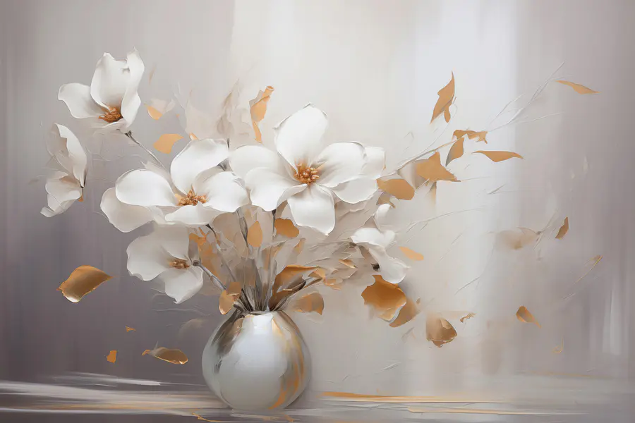 Transformeer je kamer met “Delicate Blooms in a Serene Vase”. Deze fascinerende canvasprint brengt een frisse, luchtige sfeer in elke kamer. Stel je voor dat je je woonkamer binnenloopt en meteen begroet wordt door die sierlijke witte bloemen die zachtjes wiegen alsof ze gekust worden door een zacht briesje. Het is het soort kunstwerk dat een gesprek op gang brengt en uitnodigt tot dagdromen, zoals het plannen van een tuinfeest of gewoon genieten van een rustig moment met een kopje thee. De gedempte kleuren vloeien prachtig in elkaar over en creëren een kalme sfeer. Perfect voor bloemenliefhebbers en iedereen die een vleugje natuur nodig heeft, voegt dit kunstwerk charme en warmte toe aan je interieur. Wie zou dat niet willen?