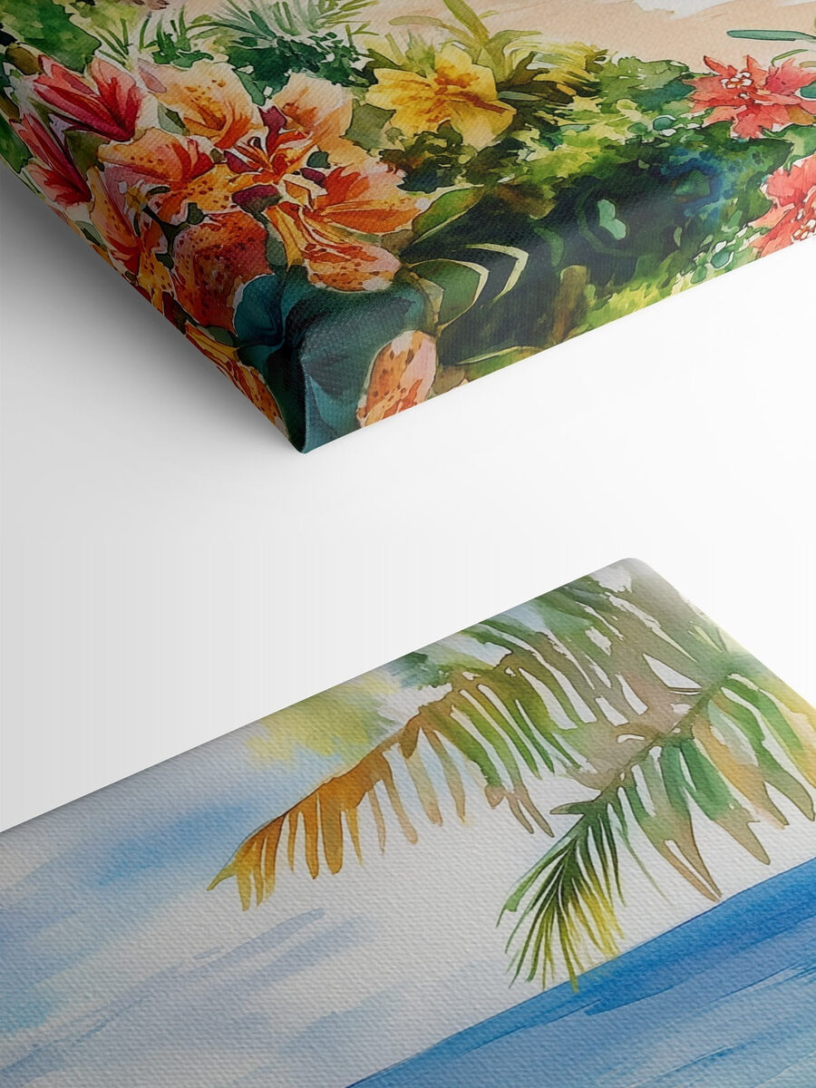 Tover elke muur om in een mini-vakantie met dit prachtige aquarelschilderij van een strandtafereel. Stel je levendige bloemen voor die barsten van kleur naast zachte, rollende golven – je kamer zal niet weten wat haar overkomt! Stel je voor dat je wegzakt in je favoriete stoel met een kop warme wijn in je hand, terwijl dit kunstwerk je meeneemt naar de zanderige kust. Het is alsof je een palmboomfeest aan je muur hebt, zonder het zand in je schoenen. Perfect om een vleugje natuur aan je ruimte toe te voegen en je op elk moment te laten dromen van een reisje langs de kust.