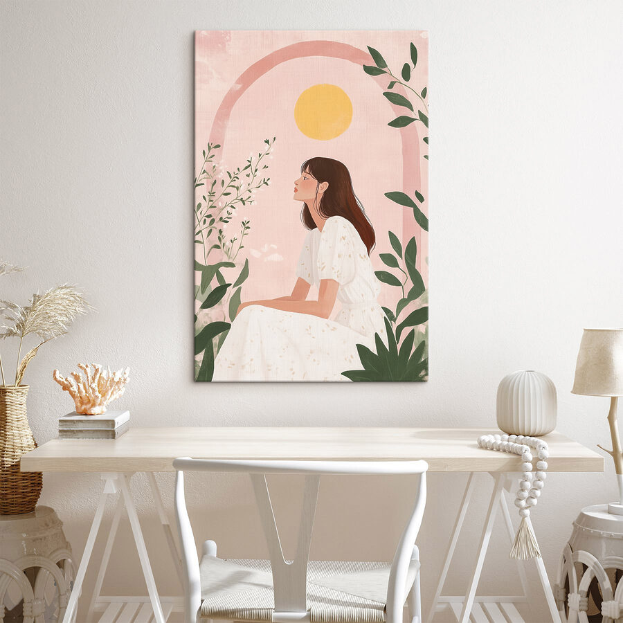 Deze chique canvasprint legt een moment van serene reflectie vast. De vrouw in haar luchtige witte jurk lijkt in gedachten verzonken, omlijst door delicaat groen tegen een dromerige roze achtergrond. Het is alsof je een stukje rust uit de natuur naar je woonkamer brengt. Stel je voor dat het aan de muur hangt – perfect voor gezellige hoekjes of als statement boven je bank. Het voegt een vleugje elegantie toe terwijl het fluistert: “Doe het rustig aan, het leven is geen race!”. Perfect voor wie op zoek is naar een vleugje kunstzinnigheid dat zowel ontspannen als opbeurend aanvoelt. Dit stuk zou wel eens kunnen inspireren tot dagdromen en rustige momenten.
