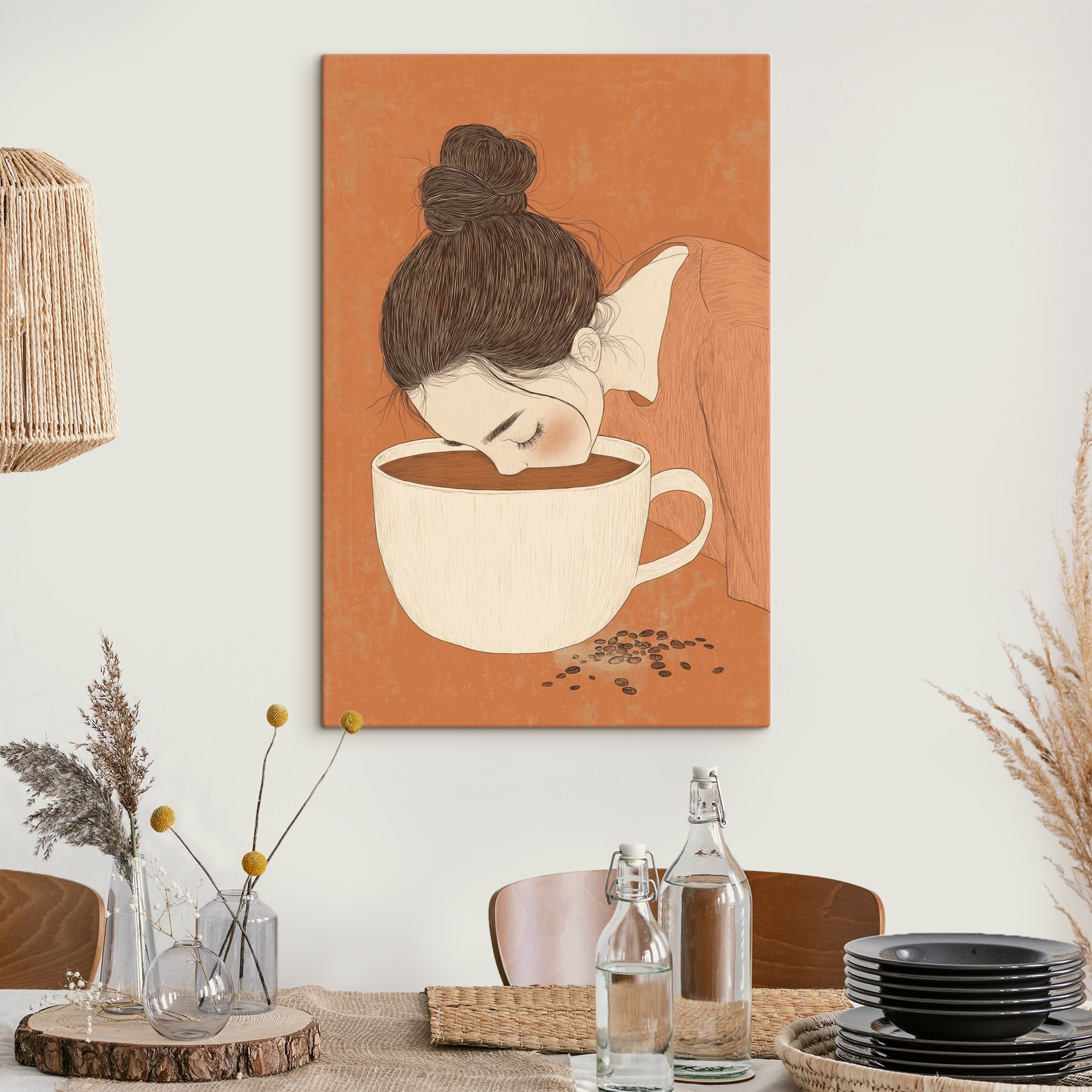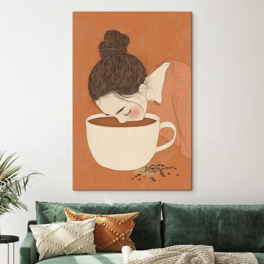 Maak kennis met deze charmante canvasprint die je zal doen glimlachen en misschien wel een paar keer zal doen giechelen! Stel je een gezellig café-gevoel voor in je eigen ruimte, waar een grillige vrouw in een te grote kop leunt, volledig verdwaald in die eerste slok koffiegeluk. De warme oranje achtergrond zorgt voor een knusse sfeer, perfect voor keukens of relaxte hoekjes. Het is alsof ze zegt: “Hé, het leven is te kort voor middelmatige koffie!”. Stel je voor dat je een glimp van dit kunstwerk opvangt op een maandagochtend – het kan net dat extra moment van vreugde inboezemen voordat je aan de dag begint. Het is een mooie gespreksstarter en geeft elke muur een vleugje warmte en humor. Het gaat allemaal om die kleine momenten, koffieliefhebbers snappen het helemaal!