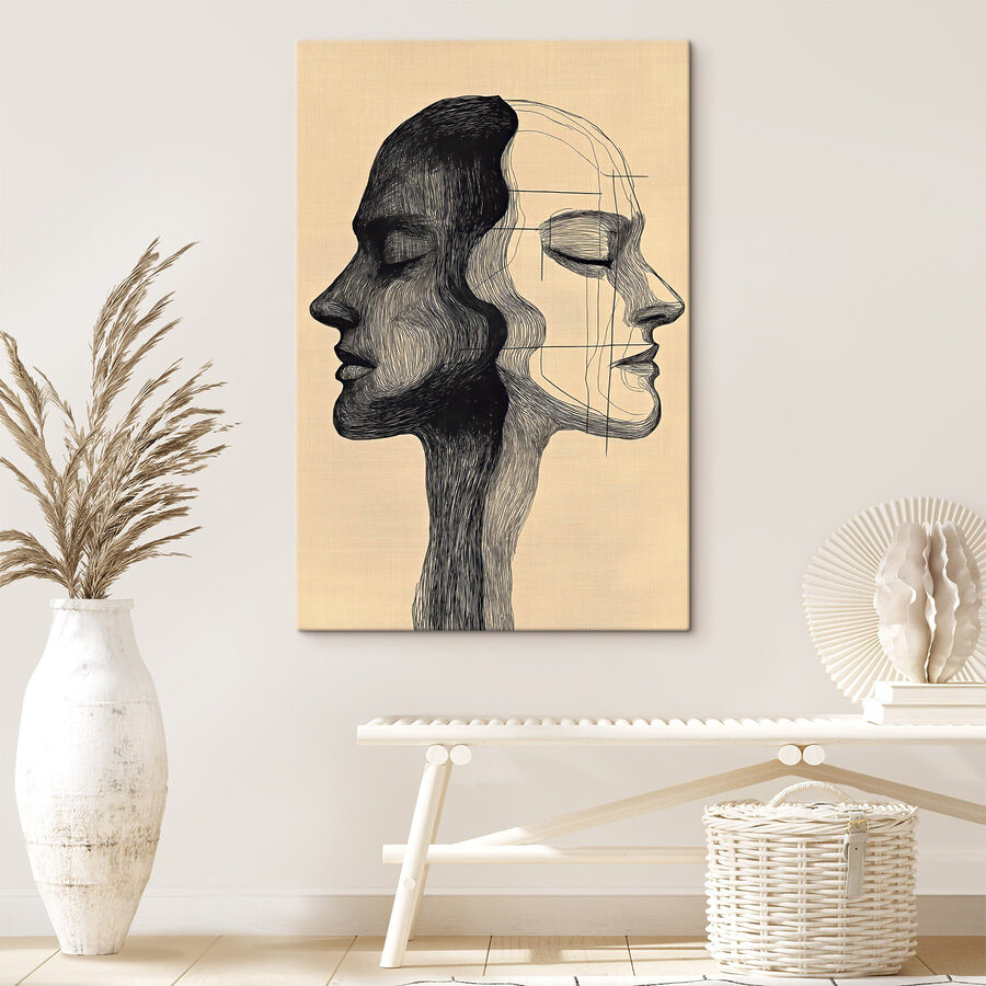 Stap in een wereld waar kunst en verbinding elkaar ontmoeten met deze fascinerende canvasprint van de gezichten van een man en een vrouw. De ingewikkelde lijnen en felle contrasten nodigen je uit om na te denken over de verhalen achter die blikken. Het is niet alleen decoratie; het is een conversatiestarter. Stel je voor dat dit stuk aan je muur hangt en charme toevoegt aan gezellige avonden of levendige bijeenkomsten. Vrienden worden er misschien door aangetrokken en delen hun gedachten en lachen over wat het kunstwerk voor hen betekent. Deze print danst tussen abstractie en emotie en wekt bij elke blik inspiratie op. Perfect voor overal in huis – geef die muren een stem!