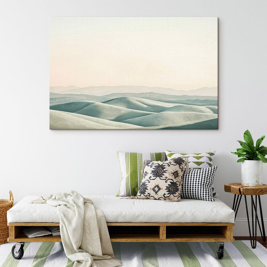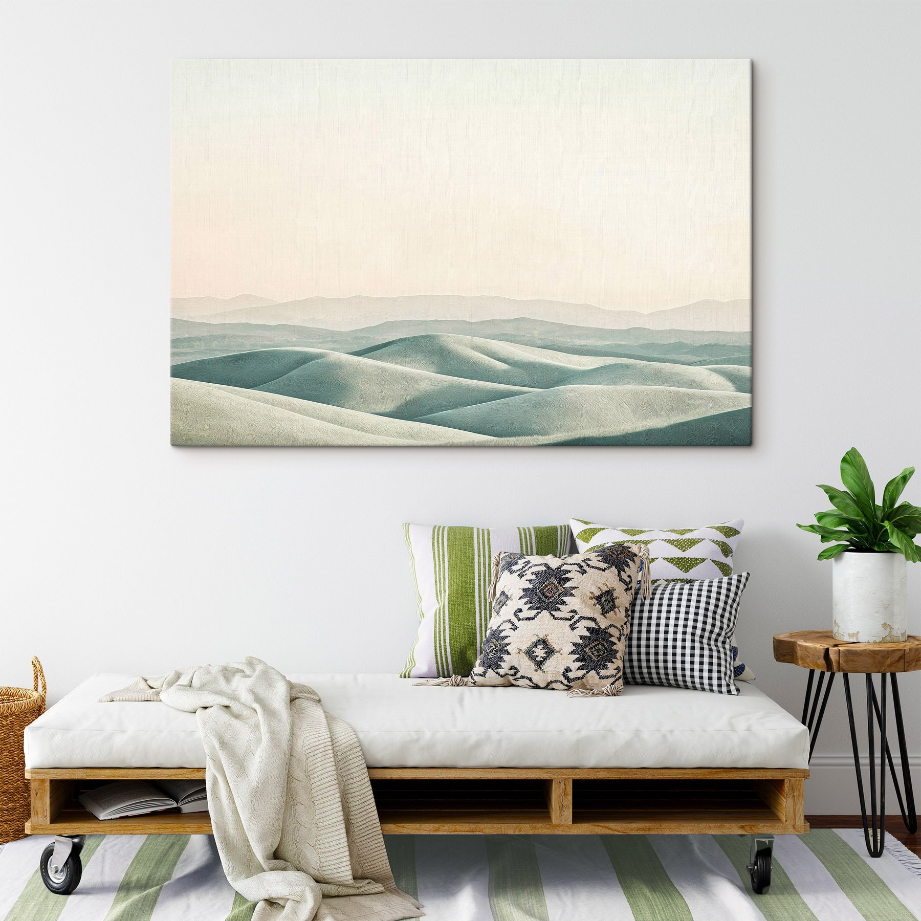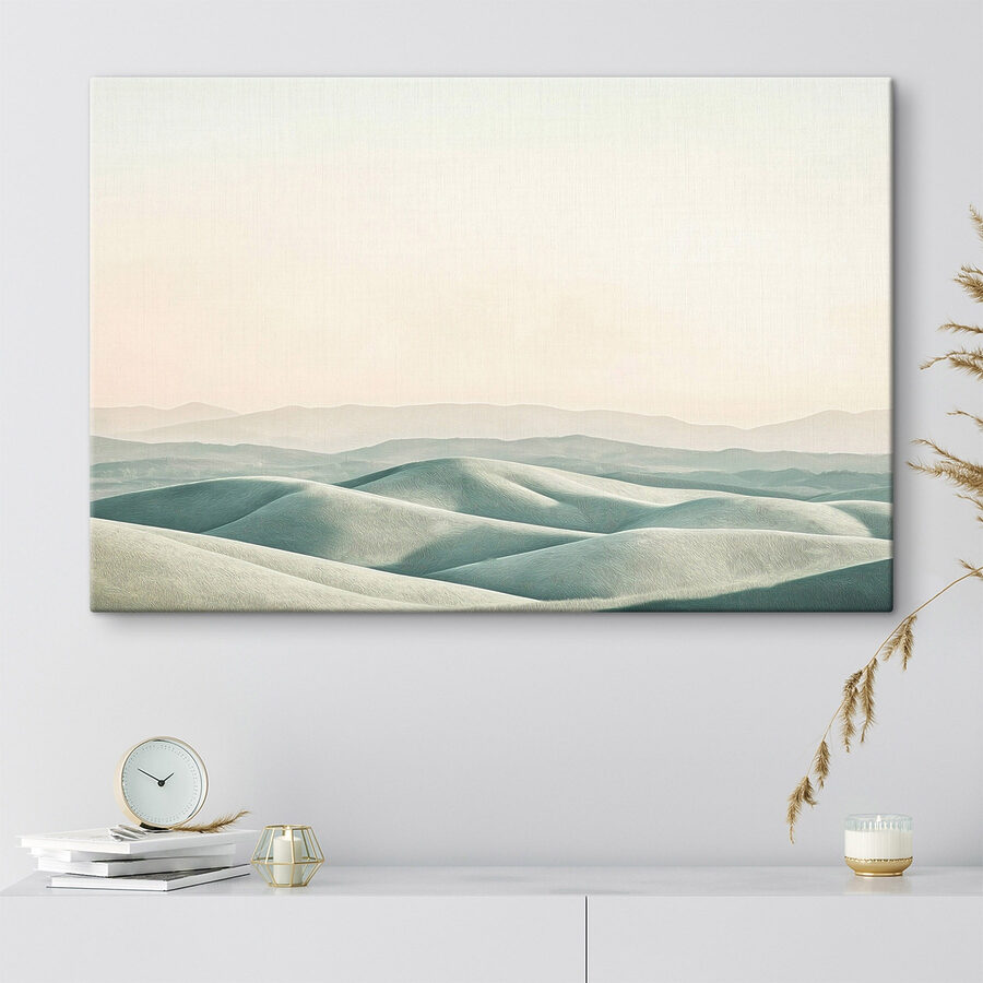 Stel je voor dat je een serene oase binnenstapt telkens als je een blik werpt op deze canvasprint van zandheuvels onder een heldere hemel. Hij is minimalistisch en toch fascinerend en brengt een rustgevende sfeer aan elke muur. Zie het al hangen boven een gezellige leeshoek of in een lichte hal – het is als een uitnodiging om wat dieper adem te halen. De zachte, glooiende heuvels fluisteren verhalen van kalmte en avontuur, waardoor het een perfecte achtergrond is voor dagdromen of rustige gesprekken. Bovendien past het bij vrijwel elke interieurstijl, van modern tot rustiek. Dit stuk is niet zomaar kunst; het is een stukje rust in een drukke wereld.