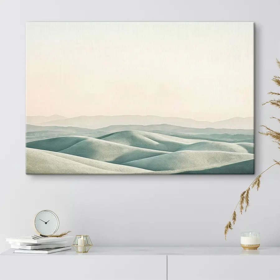 Stel je voor dat je een serene oase binnenstapt telkens als je een blik werpt op deze canvasprint van zandheuvels onder een heldere hemel. Hij is minimalistisch en toch fascinerend en brengt een rustgevende sfeer aan elke muur. Zie het al hangen boven een gezellige leeshoek of in een lichte hal – het is als een uitnodiging om wat dieper adem te halen. De zachte, glooiende heuvels fluisteren verhalen van kalmte en avontuur, waardoor het een perfecte achtergrond is voor dagdromen of rustige gesprekken. Bovendien past het bij vrijwel elke interieurstijl, van modern tot rustiek. Dit stuk is niet zomaar kunst; het is een stukje rust in een drukke wereld.