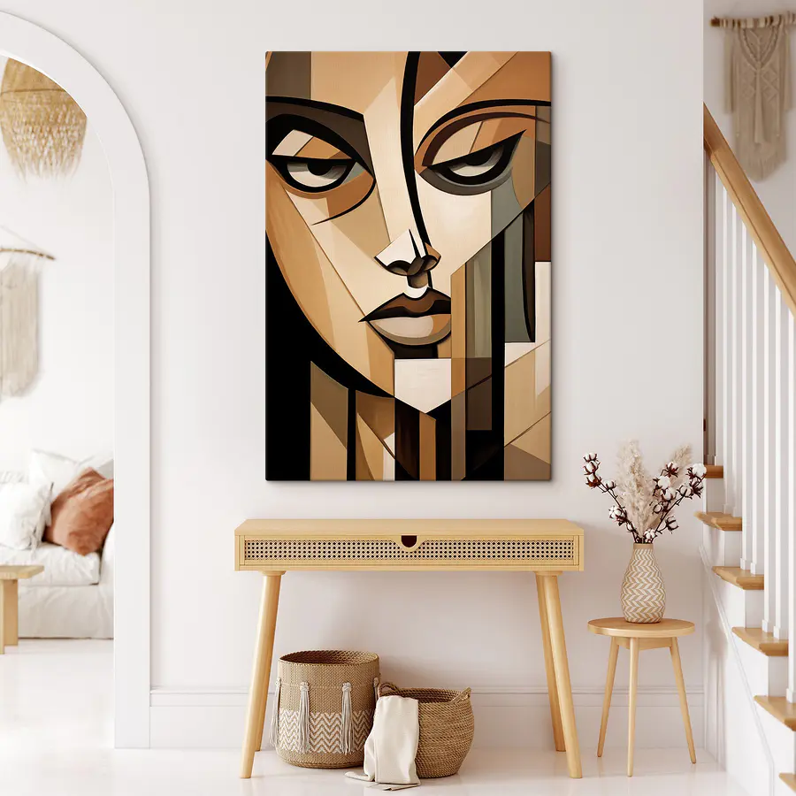 Deze fascinerende canvasprint van een vrouwengezicht brengt een vleugje intrige in elke ruimte. Met zijn abstracte lijnen en warme aardetinten is het net een gespreksstarter zonder ook maar een woord te zeggen. Stel je eens voor hoe het je woonkamer zou kunnen veranderen: vrienden die stoppen om het te bewonderen, oude verhalen die plotseling weer de kop opsteken. Het is niet zomaar een kunstwerk; het is een stemming. De krachtige streken en doordachte uitdrukking nodigen uit tot dagdromen en reflecties. Hang het op een plek waar het licht op het oppervlak danst en kijk hoe het tot leven komt – perfect voor gezellige avonden met een goed boek of gewoon een kop koffie in de hand. Laat je muren een beetje meer jou voelen.