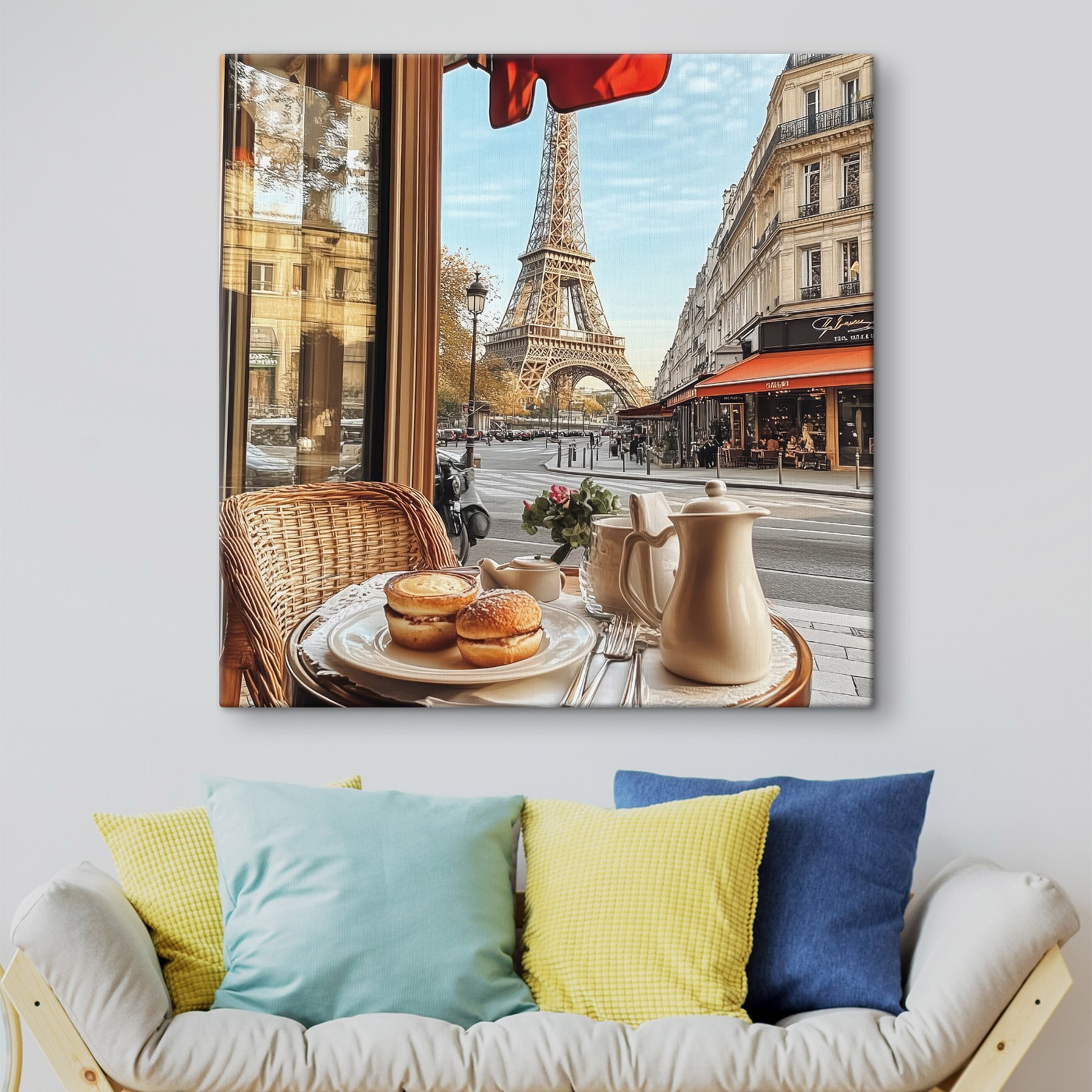 Stelt u zich eens voor: koffie drinken in een charmant café, botergebakjes op uw bord en de iconische toren die door het raam naar binnen gluurt. Deze canvasprint brengt die gezellige sfeer in elke kamer. Het draait allemaal om die kleine momenten, nietwaar? De manier waarop het licht van de straten danst en dat gevoel van tevredenheid bij het genieten van een heerlijk ontbijt. Het is als een stukje Parijse magie – perfect om dagdromen te stimuleren. Voeg het toe aan je interieur en plotseling voelt zelfs je gewone dinsdagochtend een beetje specialer. Wie wist dat kunst zo uitnodigend kon zijn?