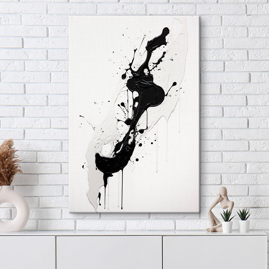 Dit kunstwerk is niet zomaar een doek; het is een speelse dans van zwart en wit, verspreid over een helder oppervlak. Stel je voor dat je een kamer binnenloopt waar dit werk je begroet met uitbarstingen van creativiteit en spontaniteit. Het is alsof de kunstenaar met een knipoog een emmer verf uitgooide en zei: “Laten we plezier maken!”. Perfect voor die minimalistische sfeer of voor iedereen die op zoek is naar een opvallend stuk. Het nodigt uit tot een gesprek-iedereen zal er zijn eigen interpretatie aan geven. Of het nu inspiratie geeft of gewoon een glimlach op je gezicht tovert, het brengt een verfrissende energie in elke ruimte. Een beetje chaos kan een heerlijke manier zijn om de eentonigheid te doorbreken, vind je niet?