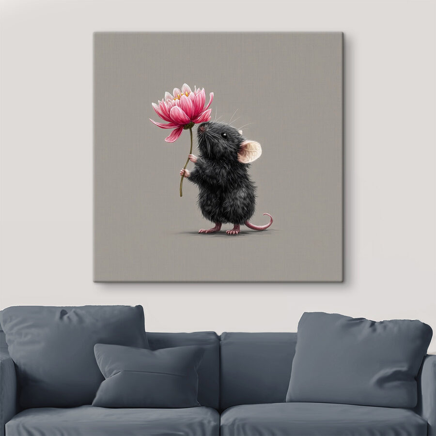 Maak kennis met de charmante canvasprint met een schattige muis die een levendige bloem vastpakt. Dit eigenzinnige stuk voegt meteen een vleugje eigenzinnigheid toe aan elke ruimte. Of het nu een glimlach brengt in een gezellig hoekje of een kinderkamer opfleurt, het speelse ontwerp zorgt voor vrolijkheid. Stel je voor dat je in je woonkamer zit en naar dit kleine ventje kijkt terwijl hij zijn bloem vasthoudt als een trots boeket. Het is een vrolijke herinnering dat schoonheid kan komen van de meest onwaarschijnlijke plaatsen. Perfect voor dierenliefhebbers of iedereen die op zoek is naar een unieke draai aan de decoratie. Het is meer dan alleen kunst – het is een conversatiestarter!