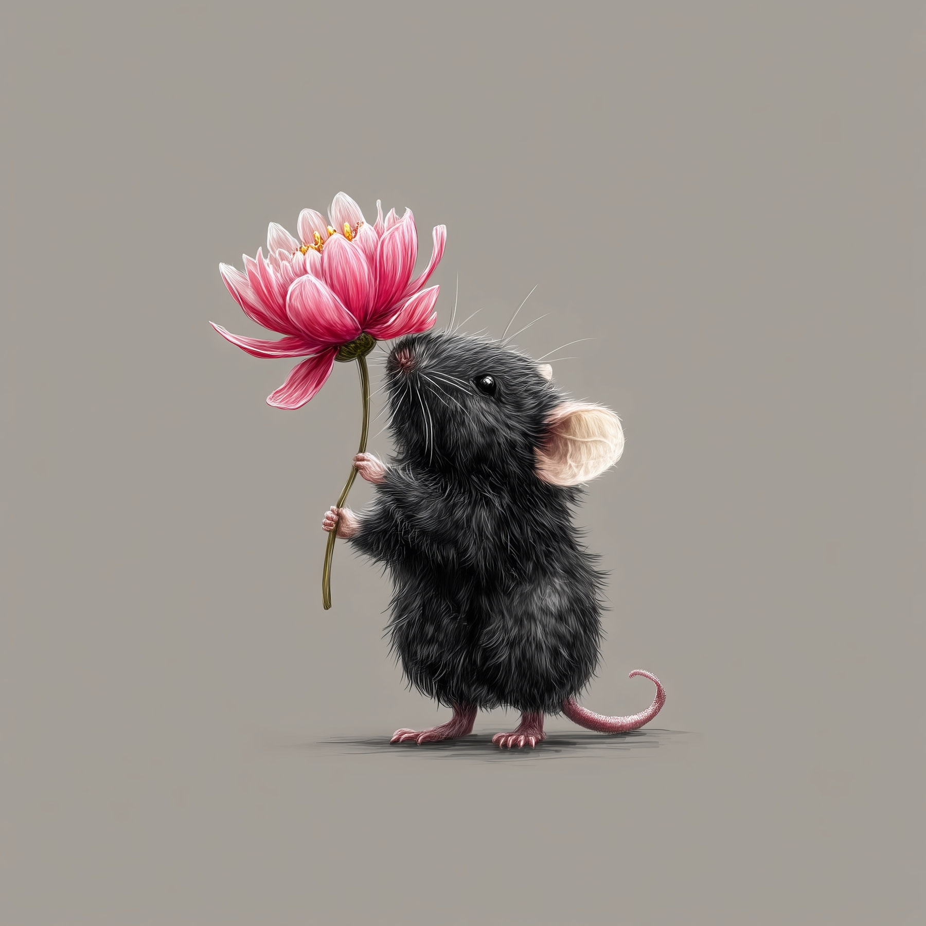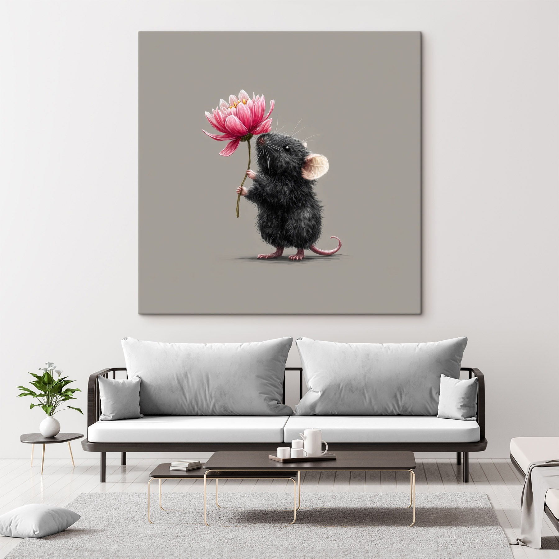 Maak kennis met de charmante canvasprint met een schattige muis die een levendige bloem vastpakt. Dit eigenzinnige stuk voegt meteen een vleugje eigenzinnigheid toe aan elke ruimte. Of het nu een glimlach brengt in een gezellig hoekje of een kinderkamer opfleurt, het speelse ontwerp zorgt voor vrolijkheid. Stel je voor dat je in je woonkamer zit en naar dit kleine ventje kijkt terwijl hij zijn bloem vasthoudt als een trots boeket. Het is een vrolijke herinnering dat schoonheid kan komen van de meest onwaarschijnlijke plaatsen. Perfect voor dierenliefhebbers of iedereen die op zoek is naar een unieke draai aan de decoratie. Het is meer dan alleen kunst – het is een conversatiestarter!